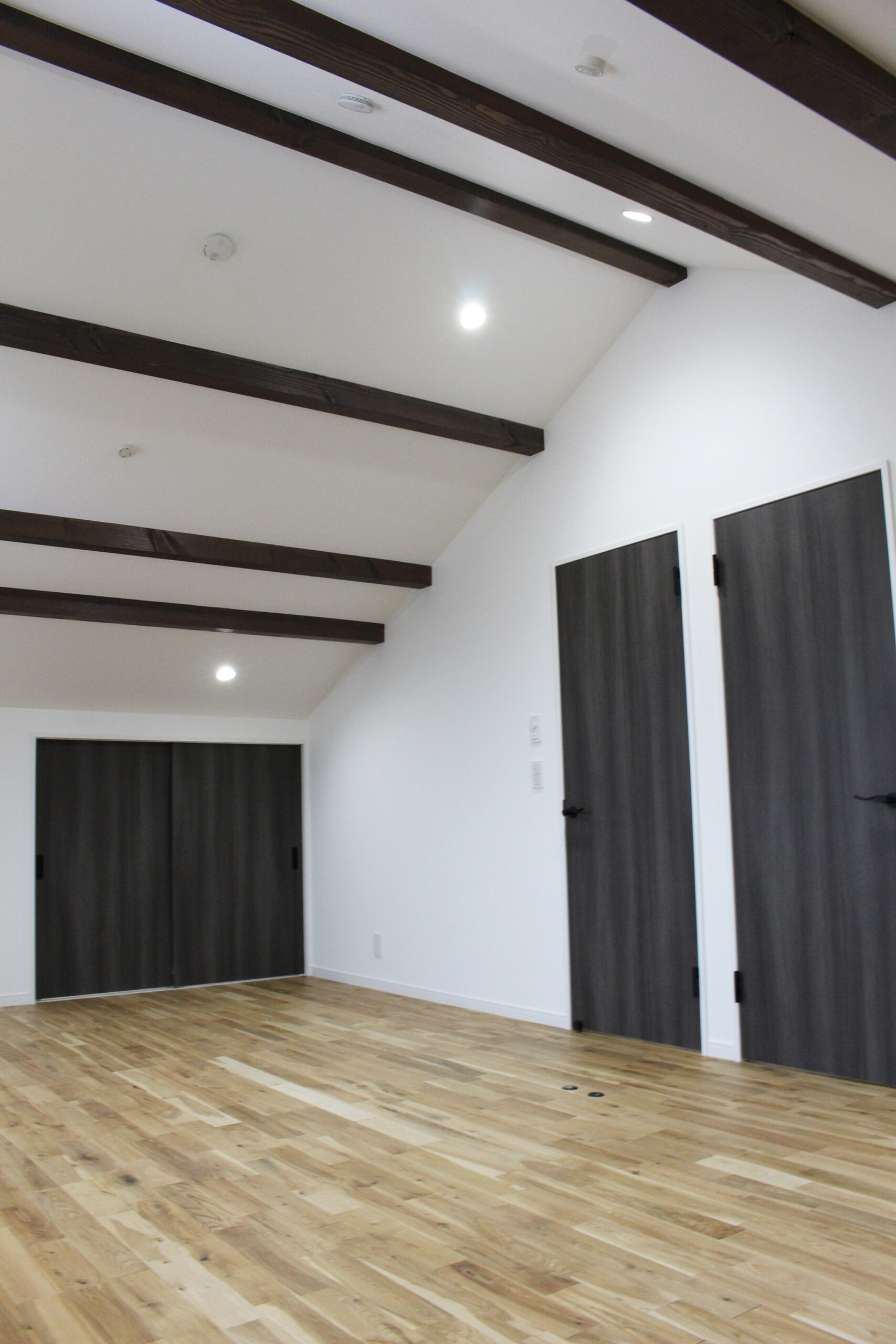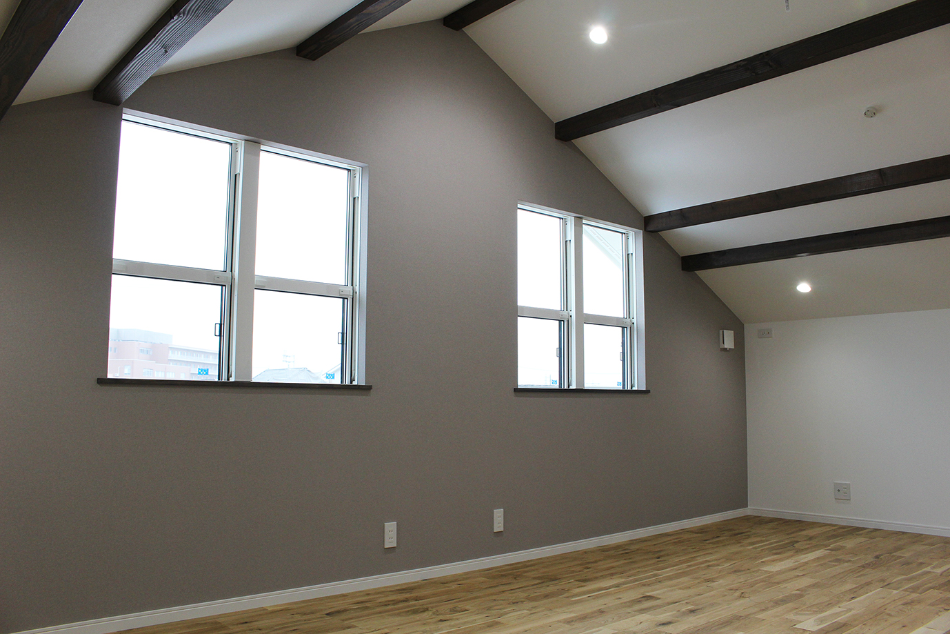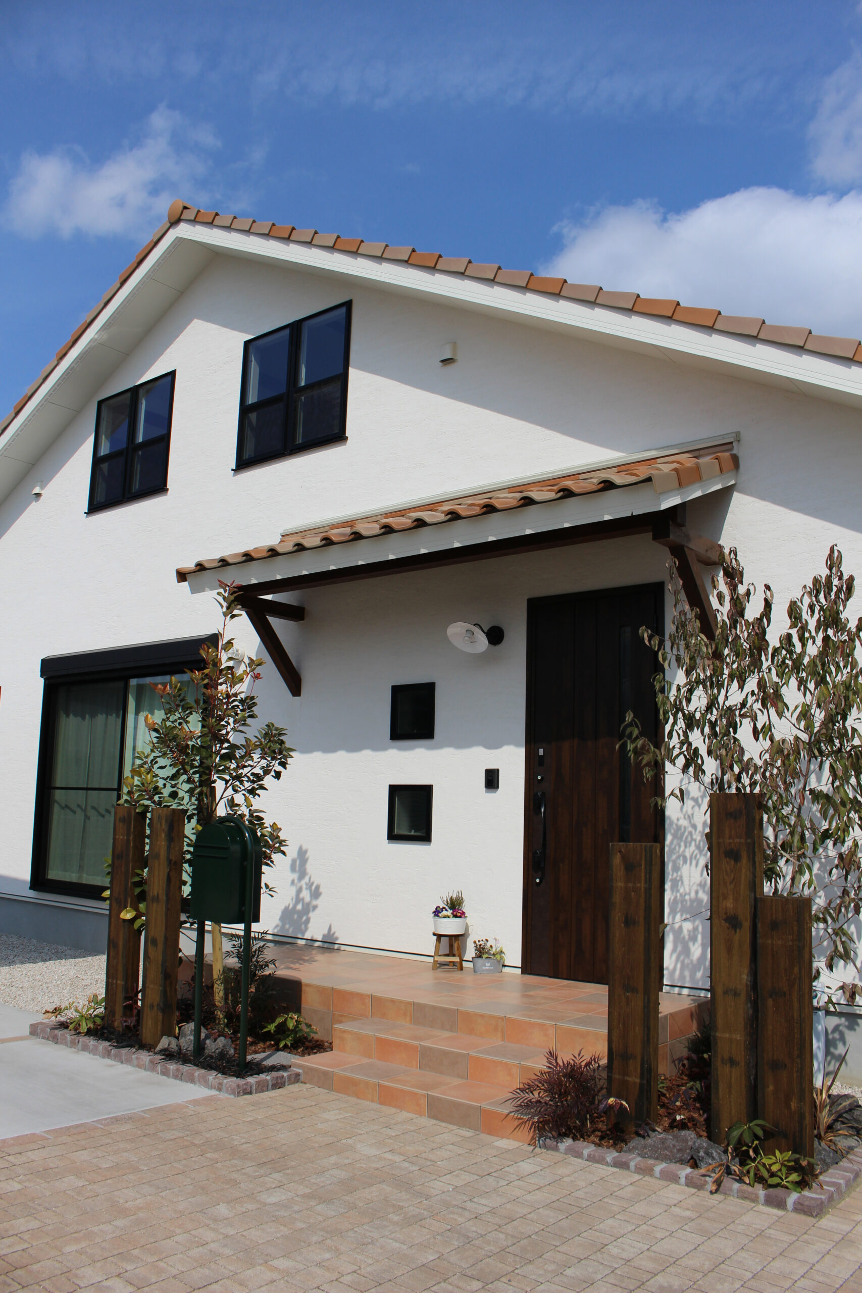 平屋のように見える大きな三角屋根と漆喰の塗り壁に、ダークカラーの窓や玄関ドア、外構デザインを組み合わせて、アンティークで落ち着いた雰囲気に仕上げました。大屋根を活かした高さのある勾配天井の子供部屋では、平天井にはない空間の動きが感じられます。小屋裏のデッドスペースをムダにしない大容量の収納も魅力的です。