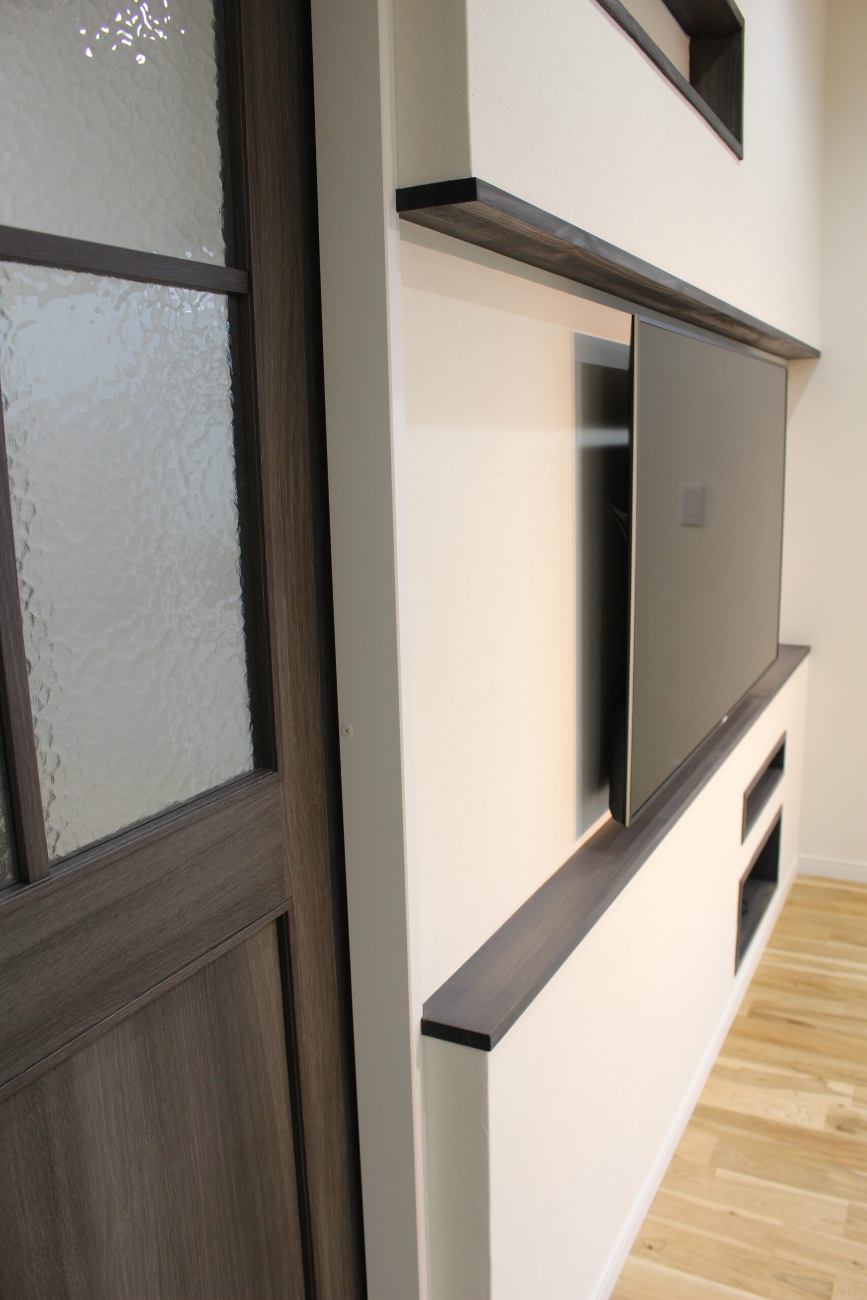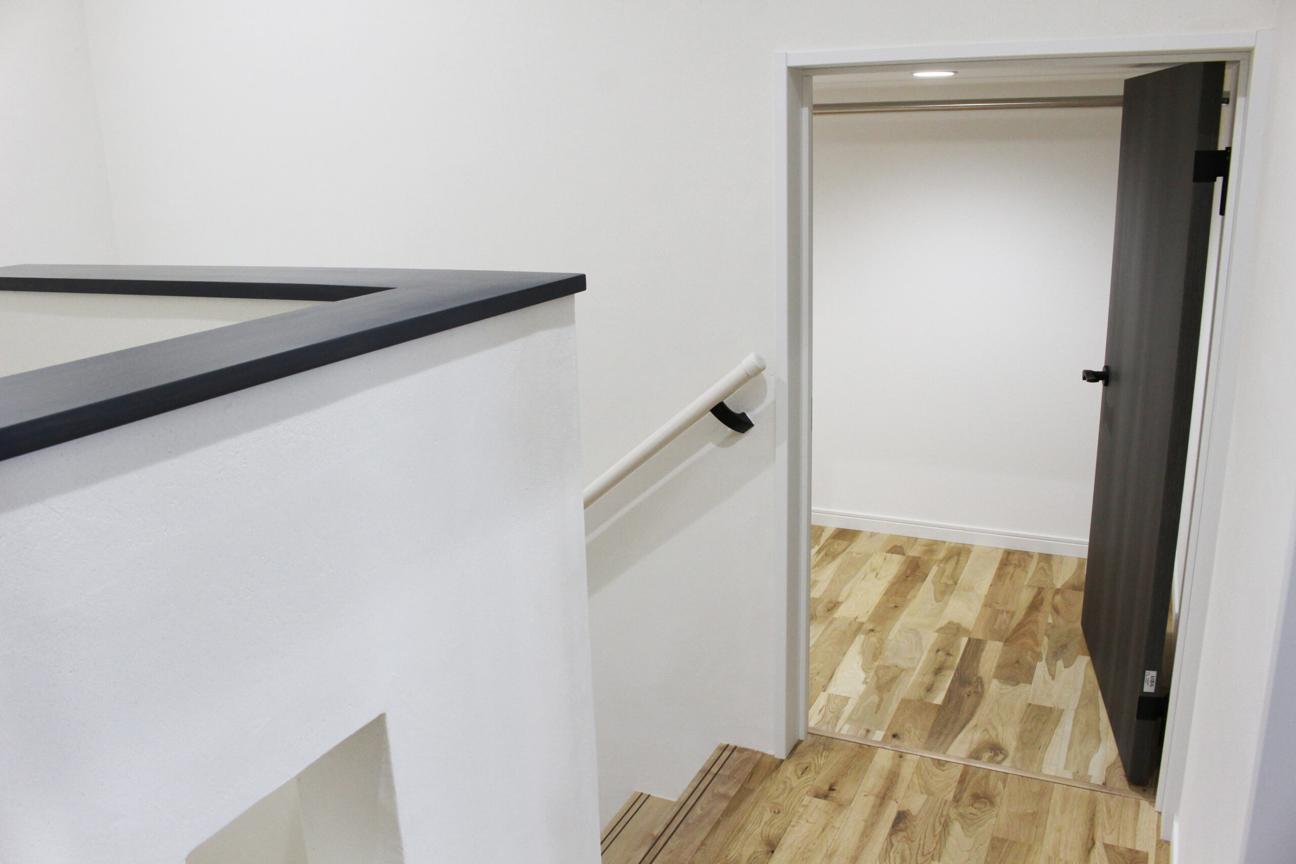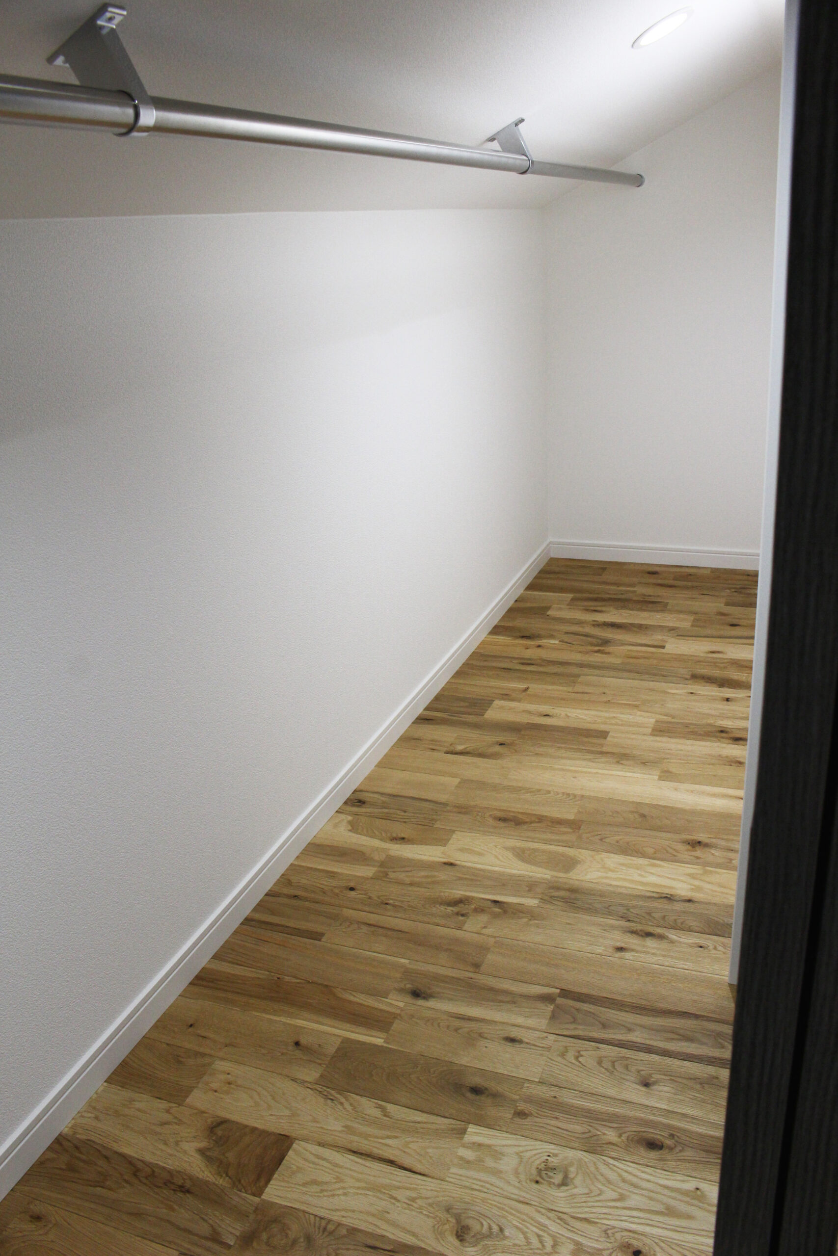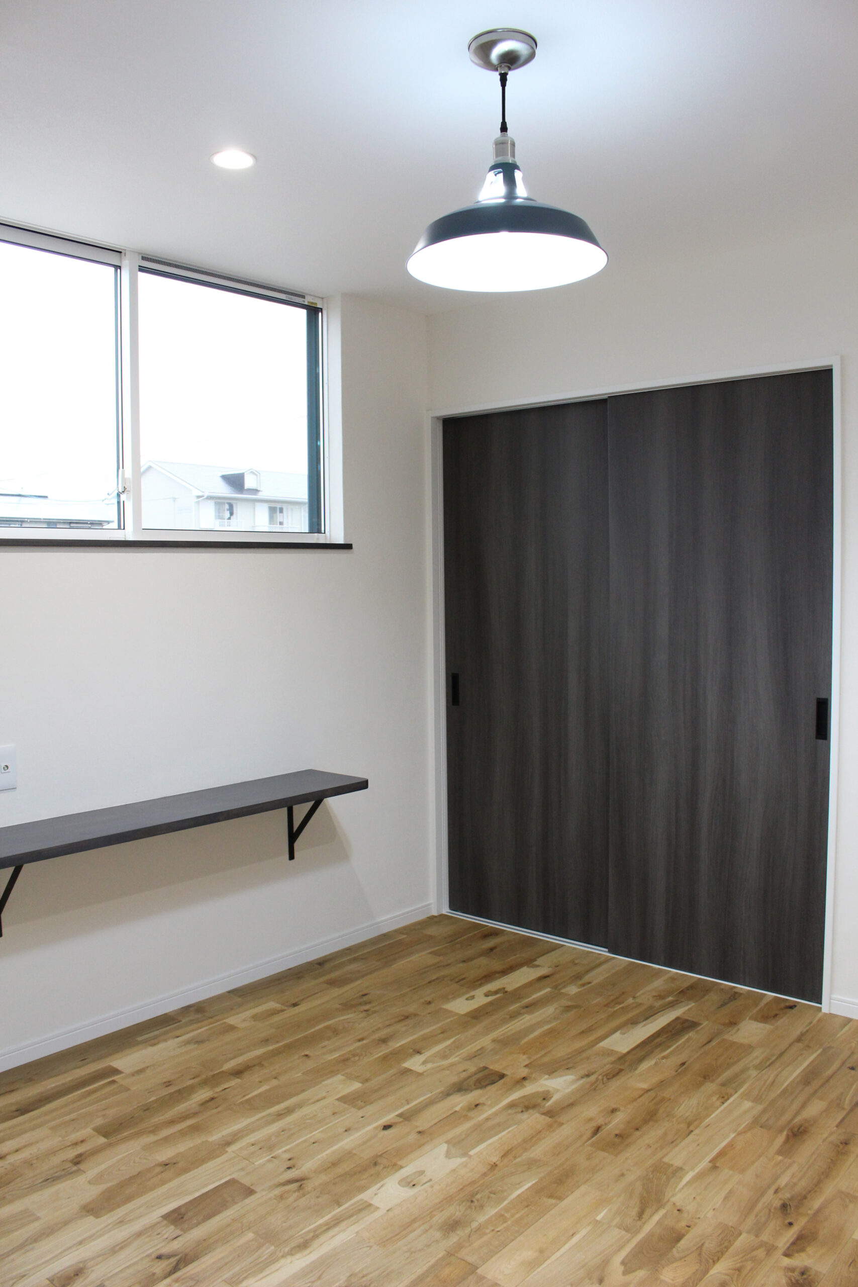 平屋のように見える大きな三角屋根と漆喰の塗り壁に、ダークカラーの窓や玄関ドア、外構デザインを組み合わせて、アンティークで落ち着いた雰囲気に仕上げました。大屋根を活かした高さのある勾配天井の子供部屋では、平天井にはない空間の動きが感じられます。小屋裏のデッドスペースをムダにしない大容量の収納も魅力的です。