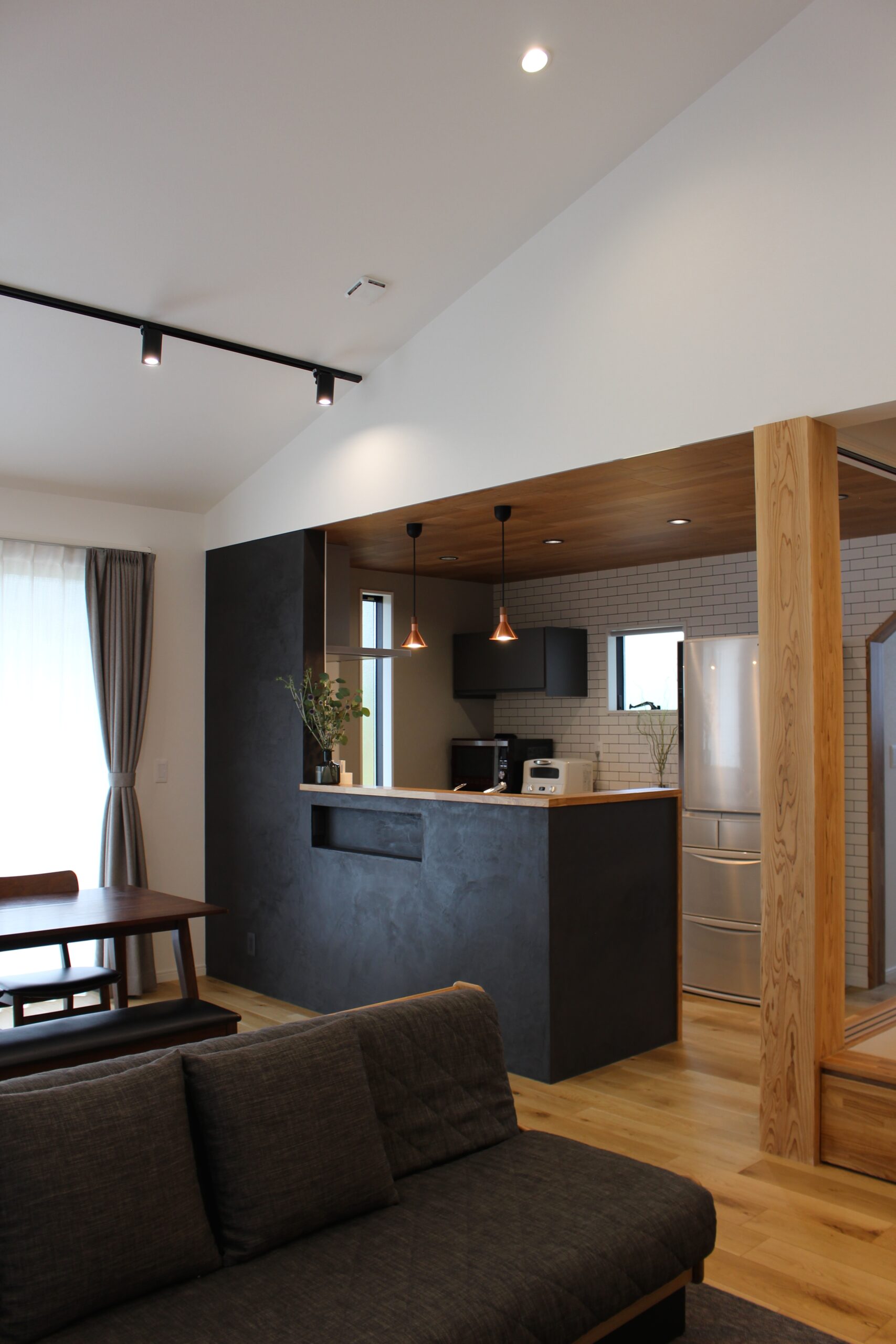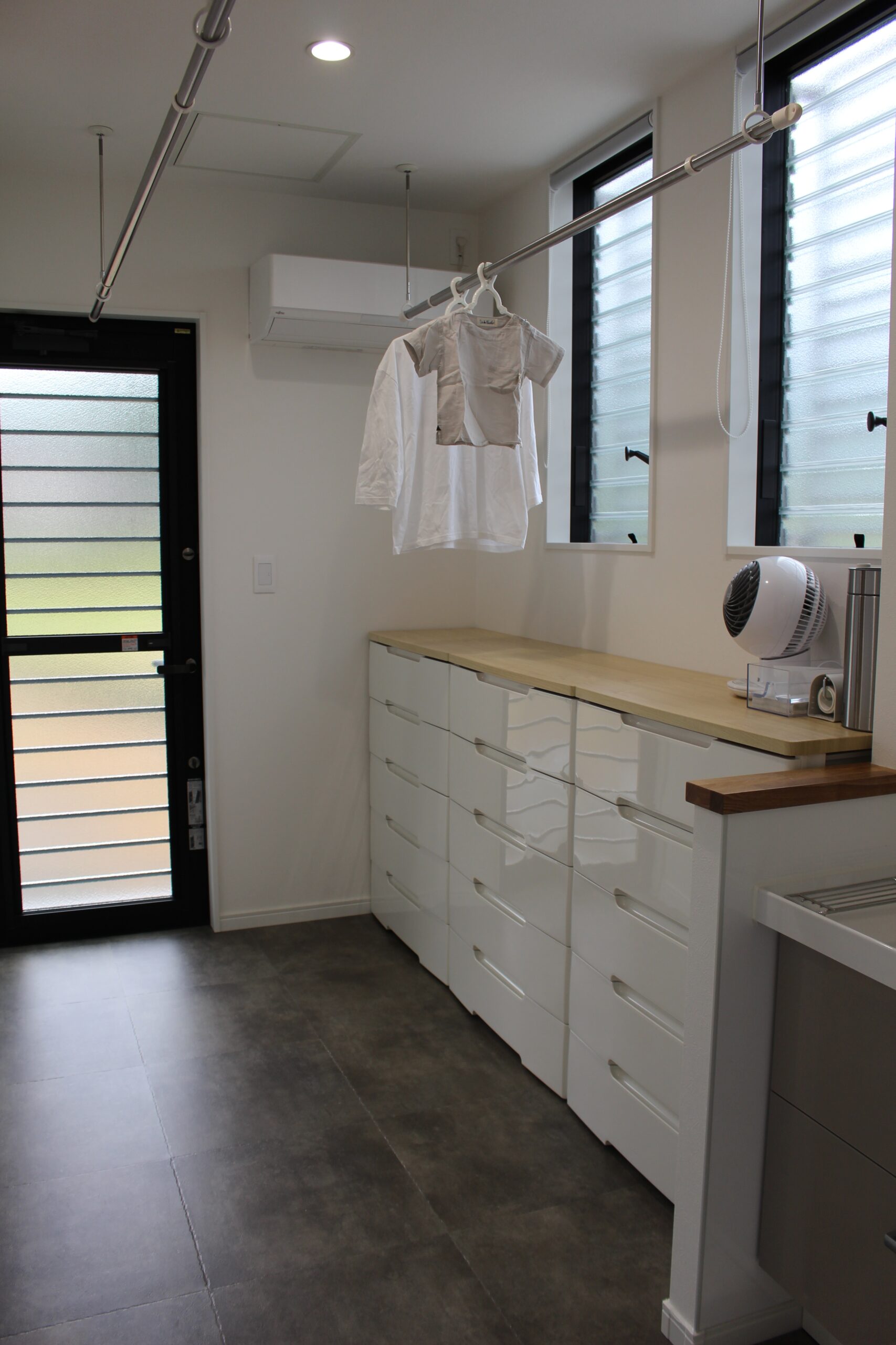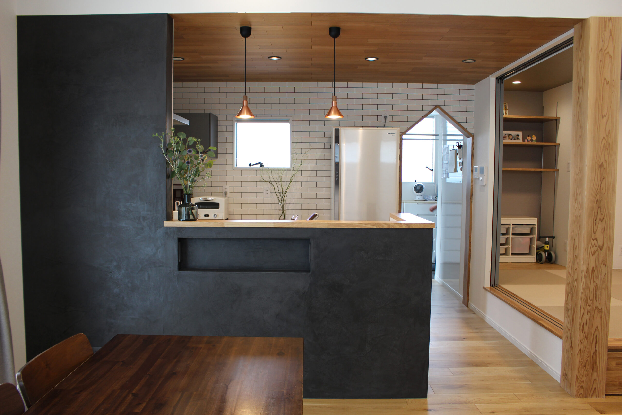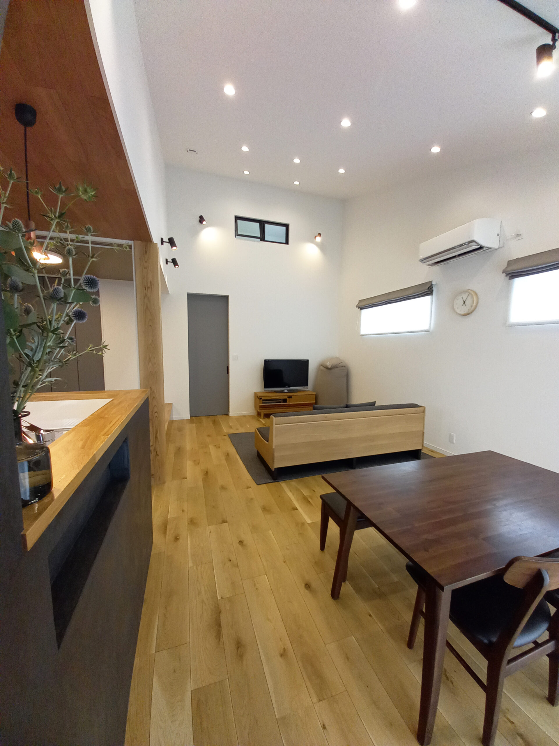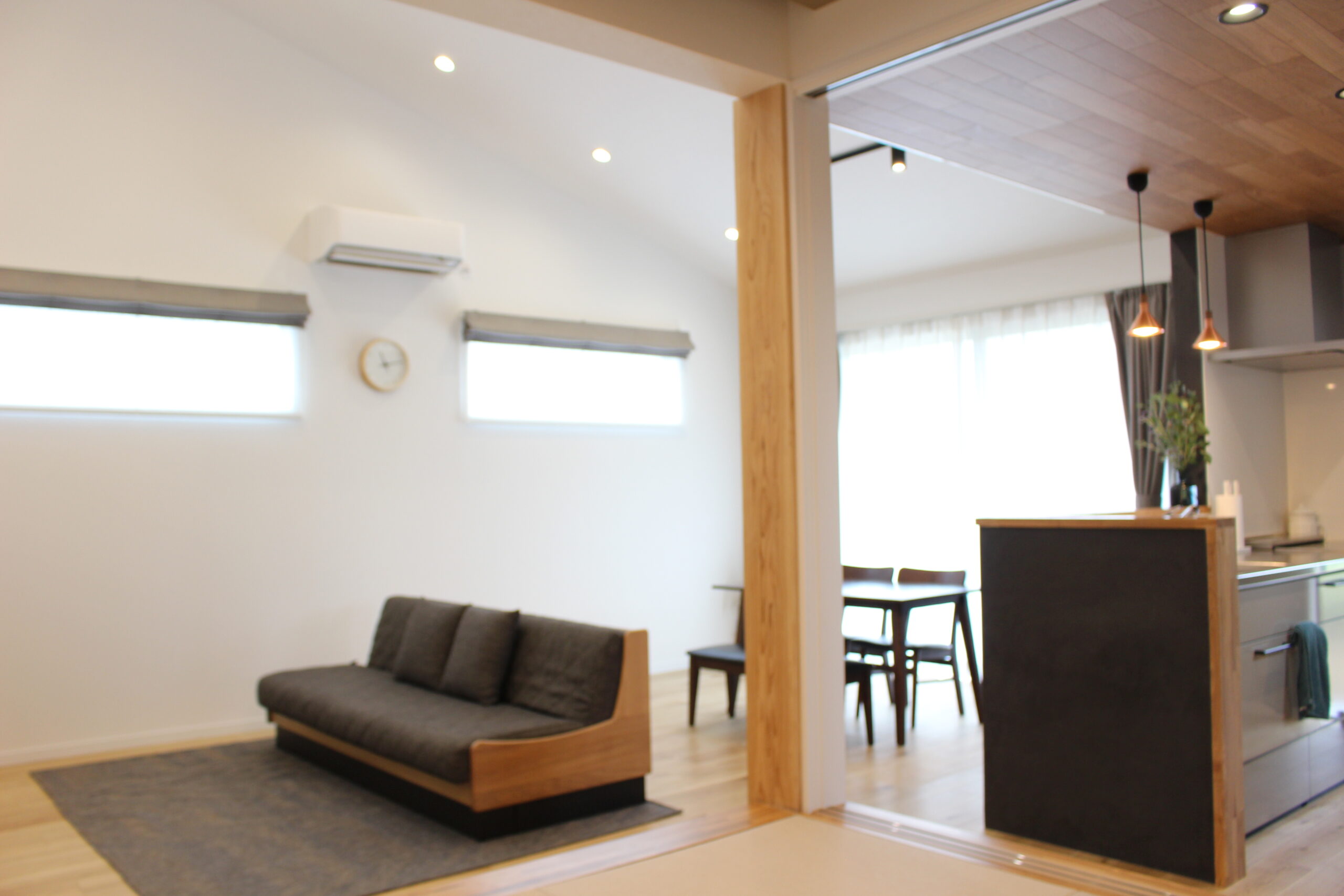道路沿いに細長い敷地の形状を活かし、周囲からの目線を気にせずにくつろげる空間づくりを目指しました。勾配天井のリビングには機能性バツグンの小上がり和室が連結していて、実際の帖数以上の広がりが感じられます。キッチンから1本の動線でつながるパントリー・サンルーム・脱衣室・浴室は、誰もが憧れる家事ラクプラン。収納上手になってしまう間取りは、毎日の生活を心おだやかなものにしてくれます。