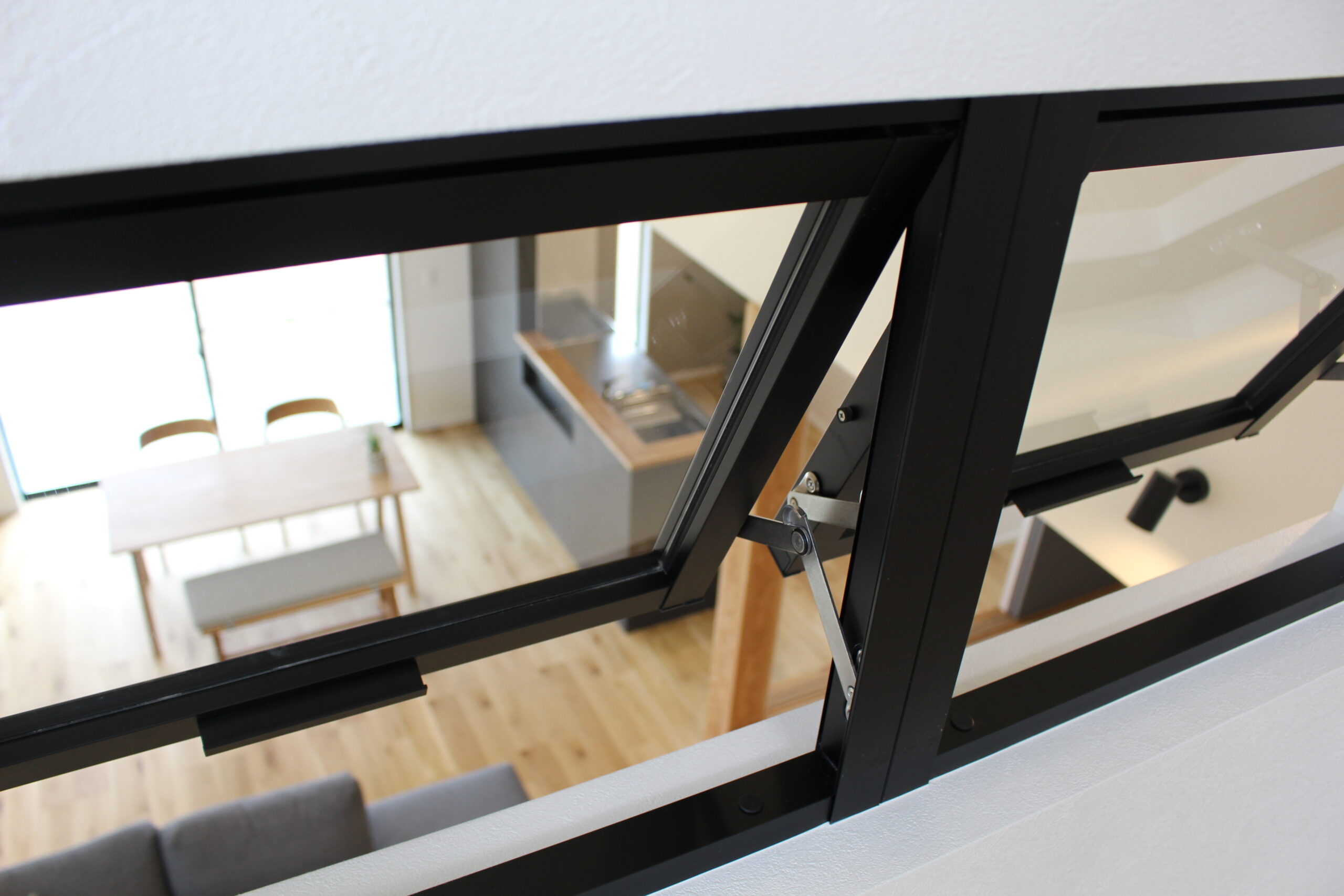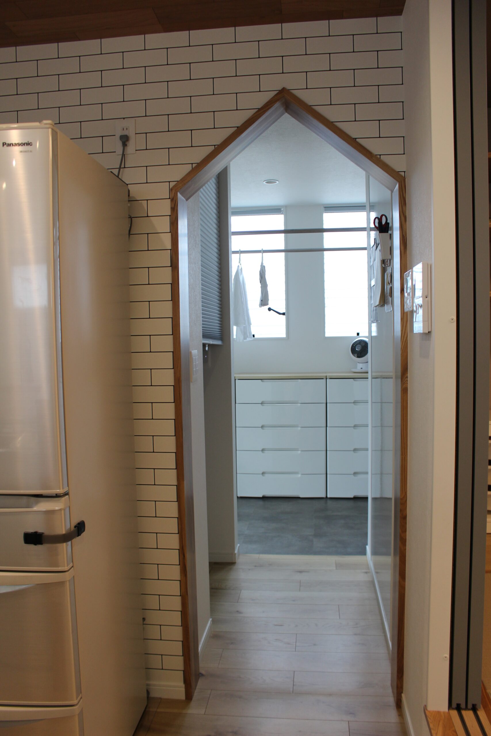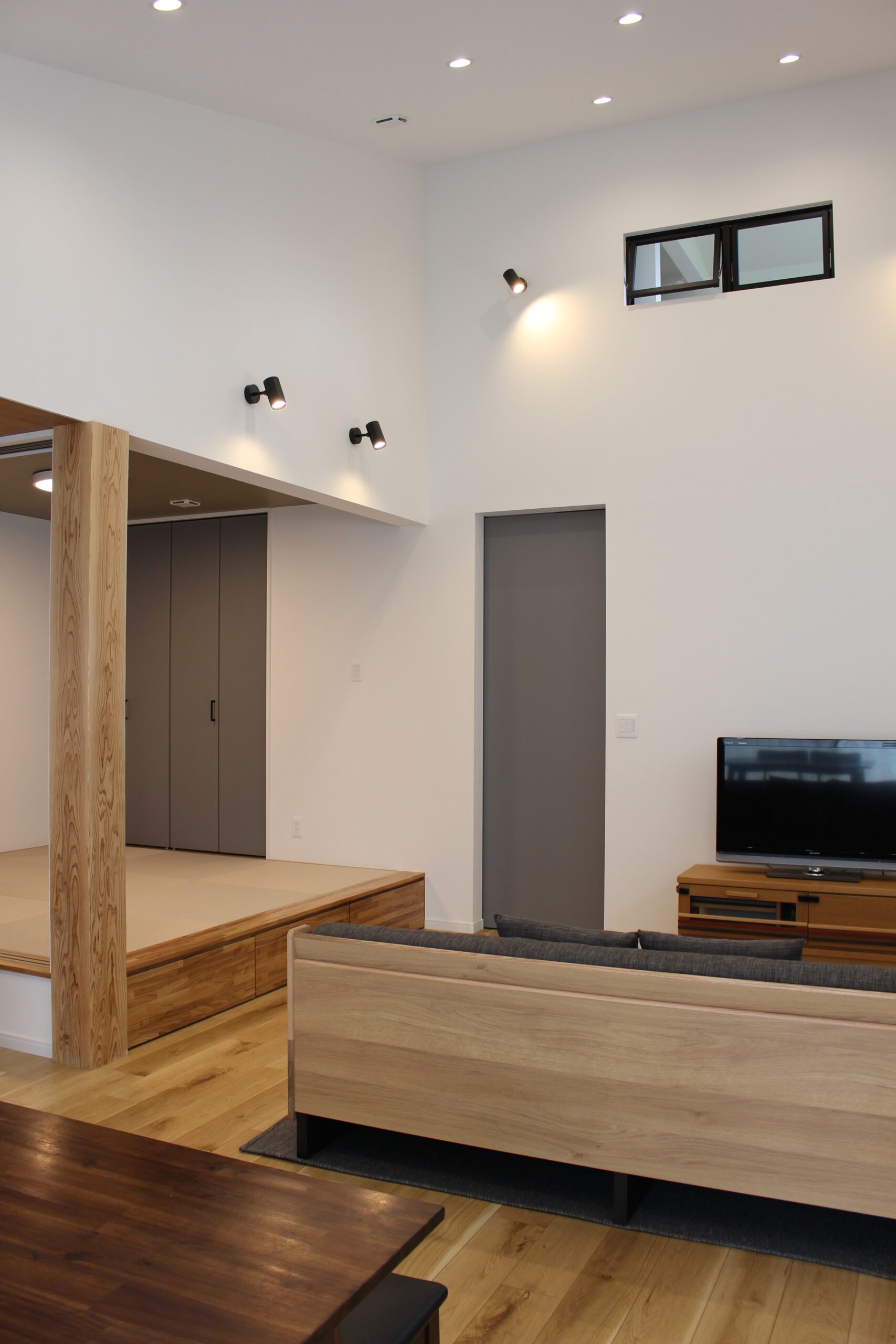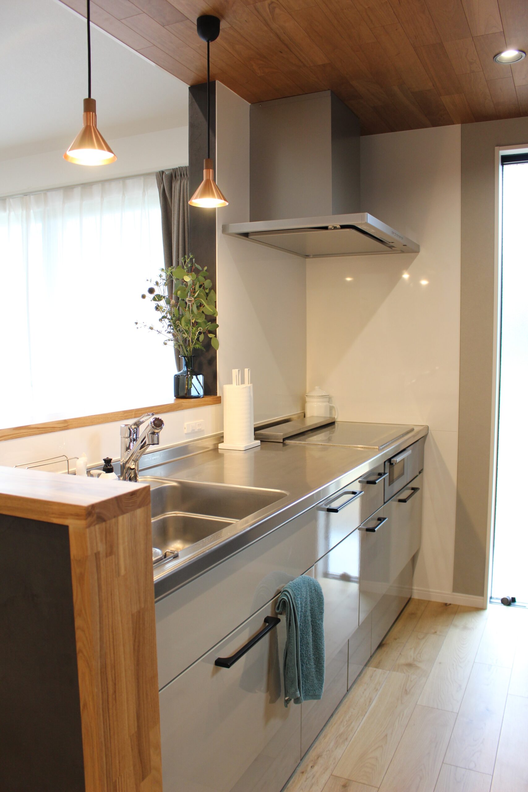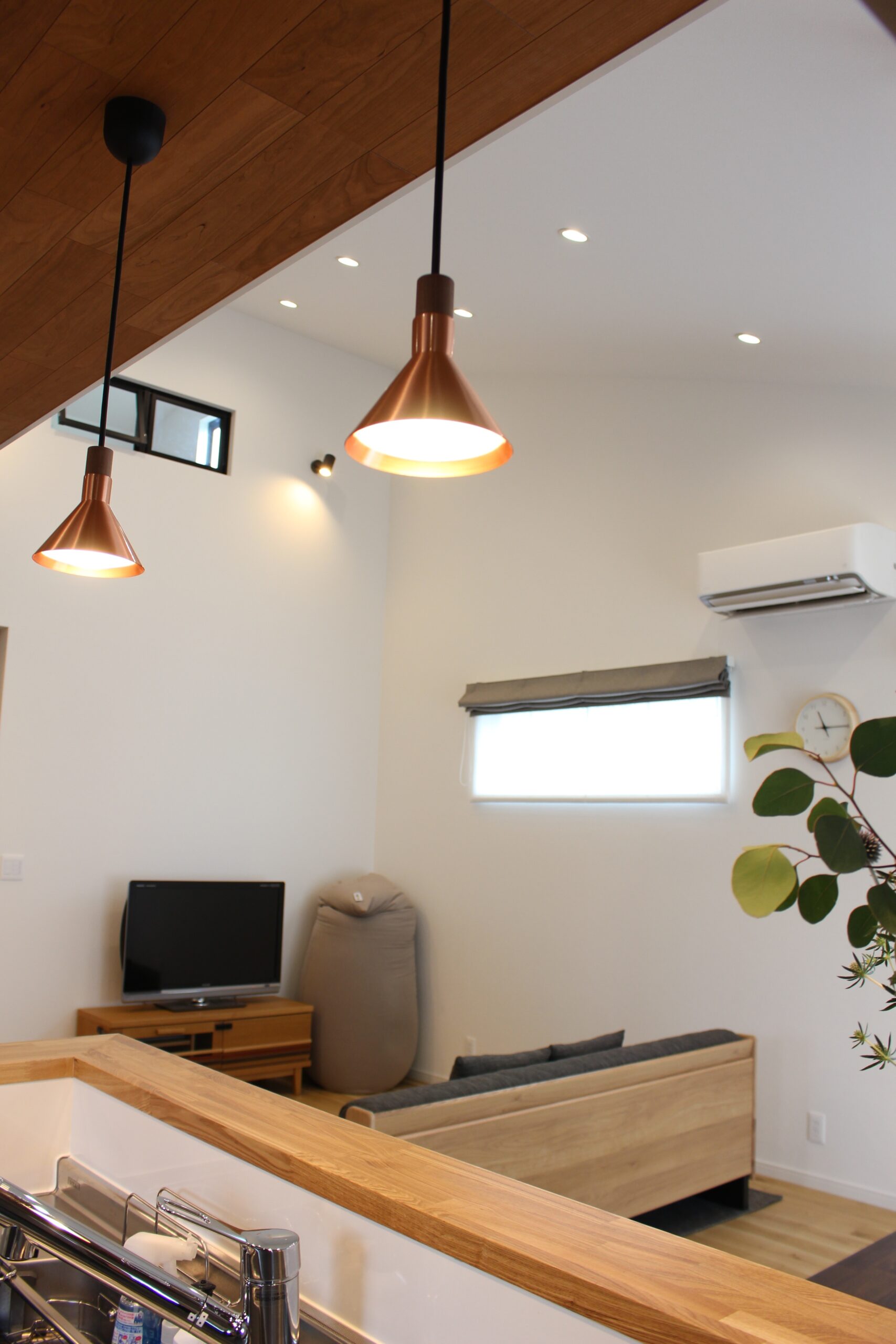 道路沿いに細長い敷地の形状を活かし、周囲からの目線を気にせずにくつろげる空間づくりを目指しました。勾配天井のリビングには機能性バツグンの小上がり和室が連結していて、実際の帖数以上の広がりが感じられます。キッチンから1本の動線でつながるパントリー・サンルーム・脱衣室・浴室は、誰もが憧れる家事ラクプラン。収納上手になってしまう間取りは、毎日の生活を心おだやかなものにしてくれます。