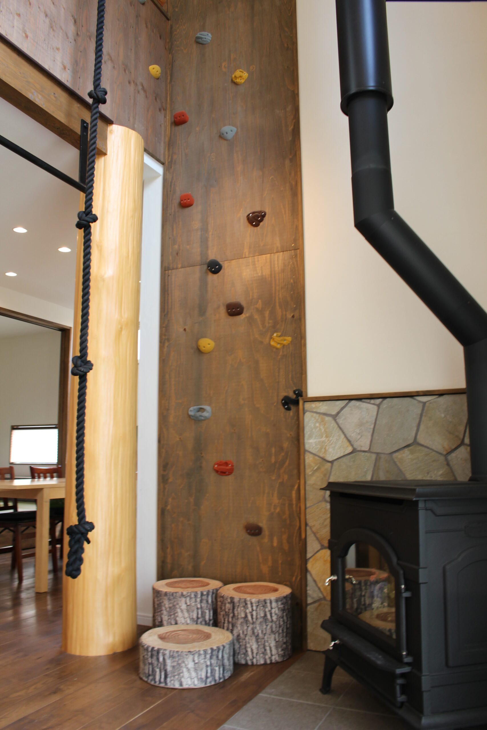 1,2階をつなぐ大屋根にガルバリウムと板貼りのツートーンな外壁、全面ガラス窓、ワイドなベランダとポーチタイルという、インパクト大な外観が第一のご希望でした。吹き抜けのリビングにはボルダリングやのぼりロープなど遊び心も満載。L字型に配置されたダイニングとリビング、小上がり和室の中心に位置するキッチンからは、家事をしていてもお子さんの様子が近くで感じとれます。