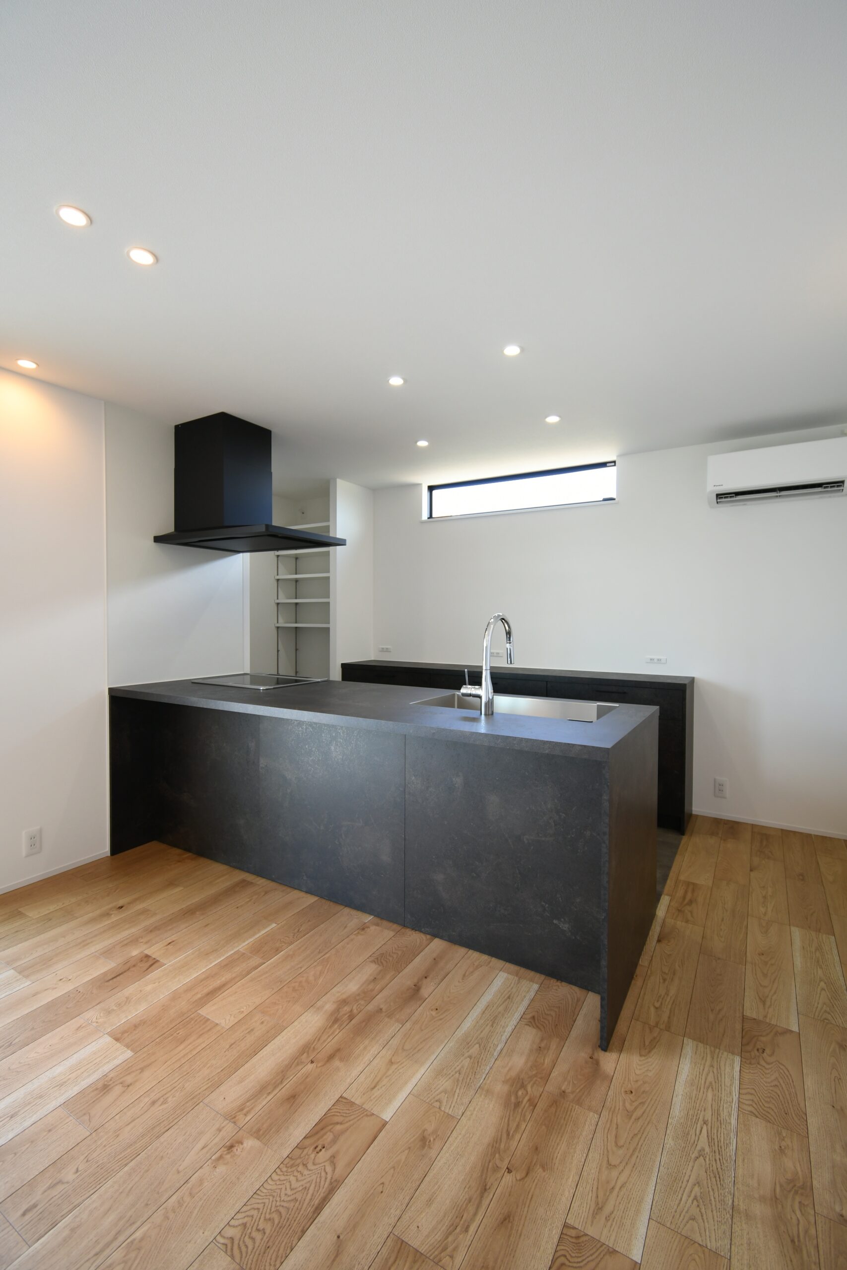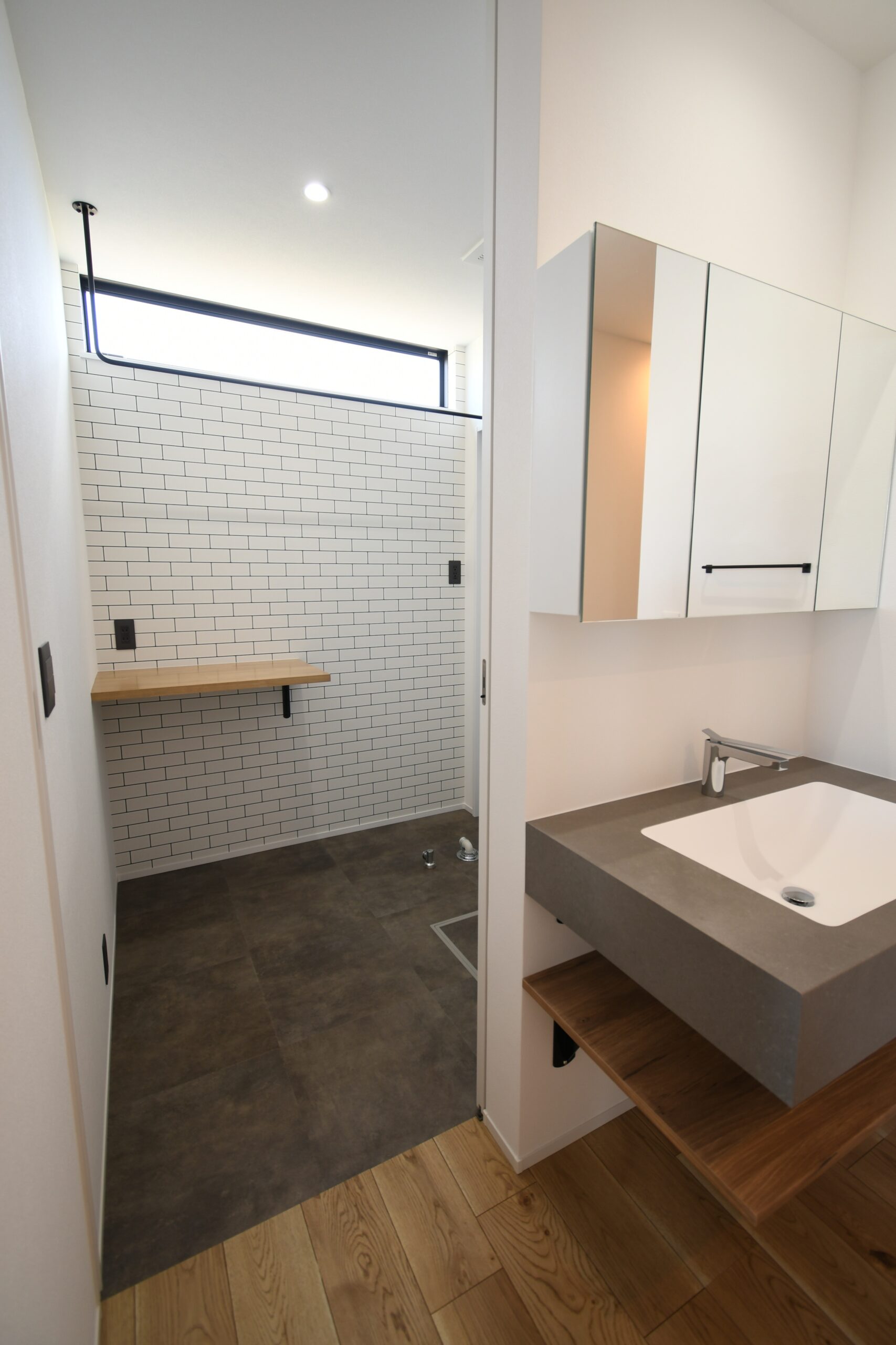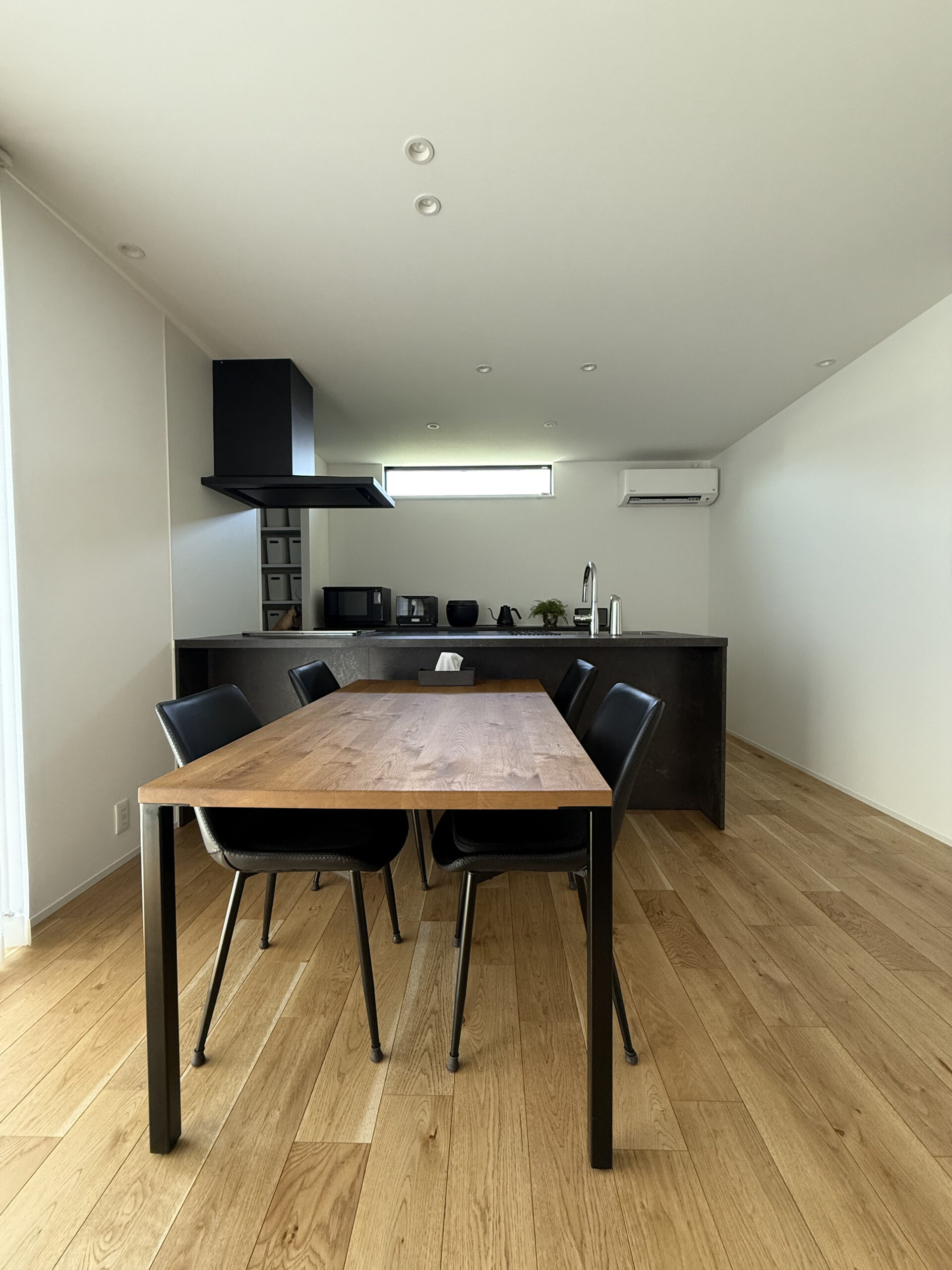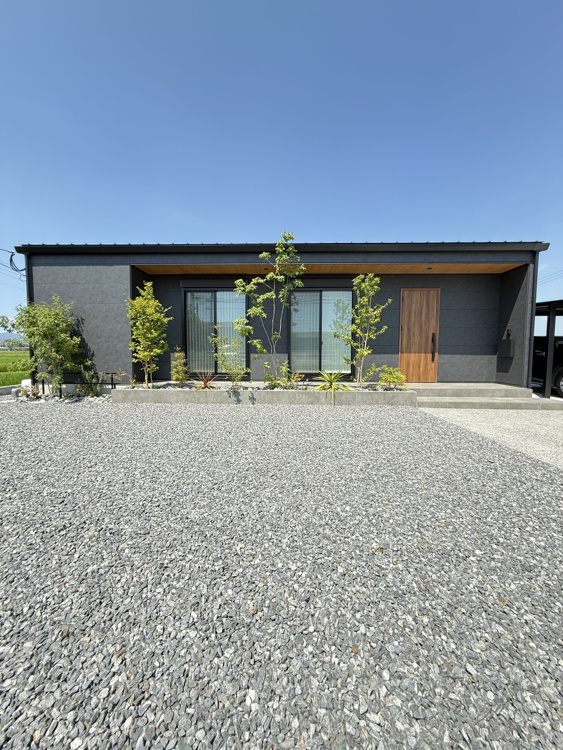 LDKを東西横長に配置し、そこから各部屋につながる間取りで廊下を最小限におさめた平屋最強プラン。奥さま憧れのグラフテクトキッチンとAICAの洗面台、ご主人は自慢のアウトドアグッズを贅沢に飾ることができる土間収納を実現するために、緩急をしっかり付けて計画しました。コンパクトな間取りながらも収納は欲しい場所に整っていて、住みやすさもキッチリ確保しています。