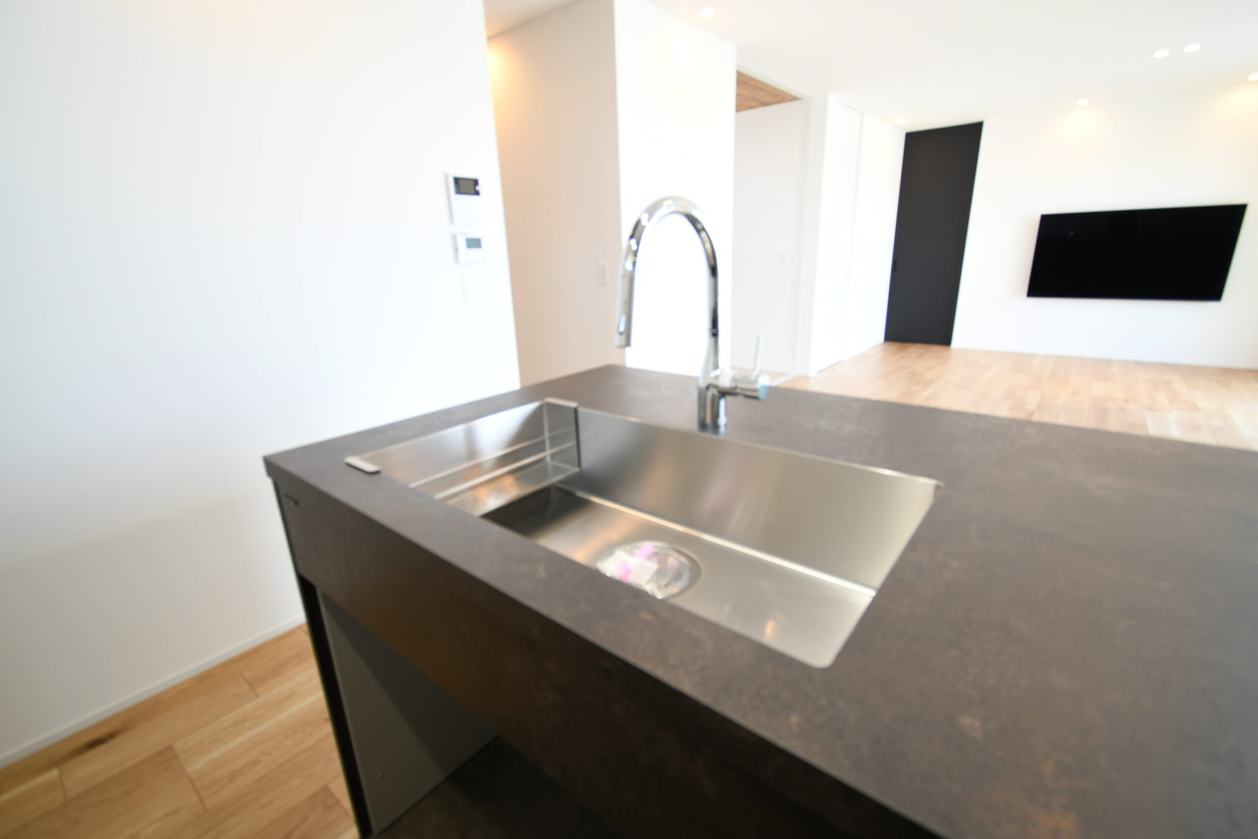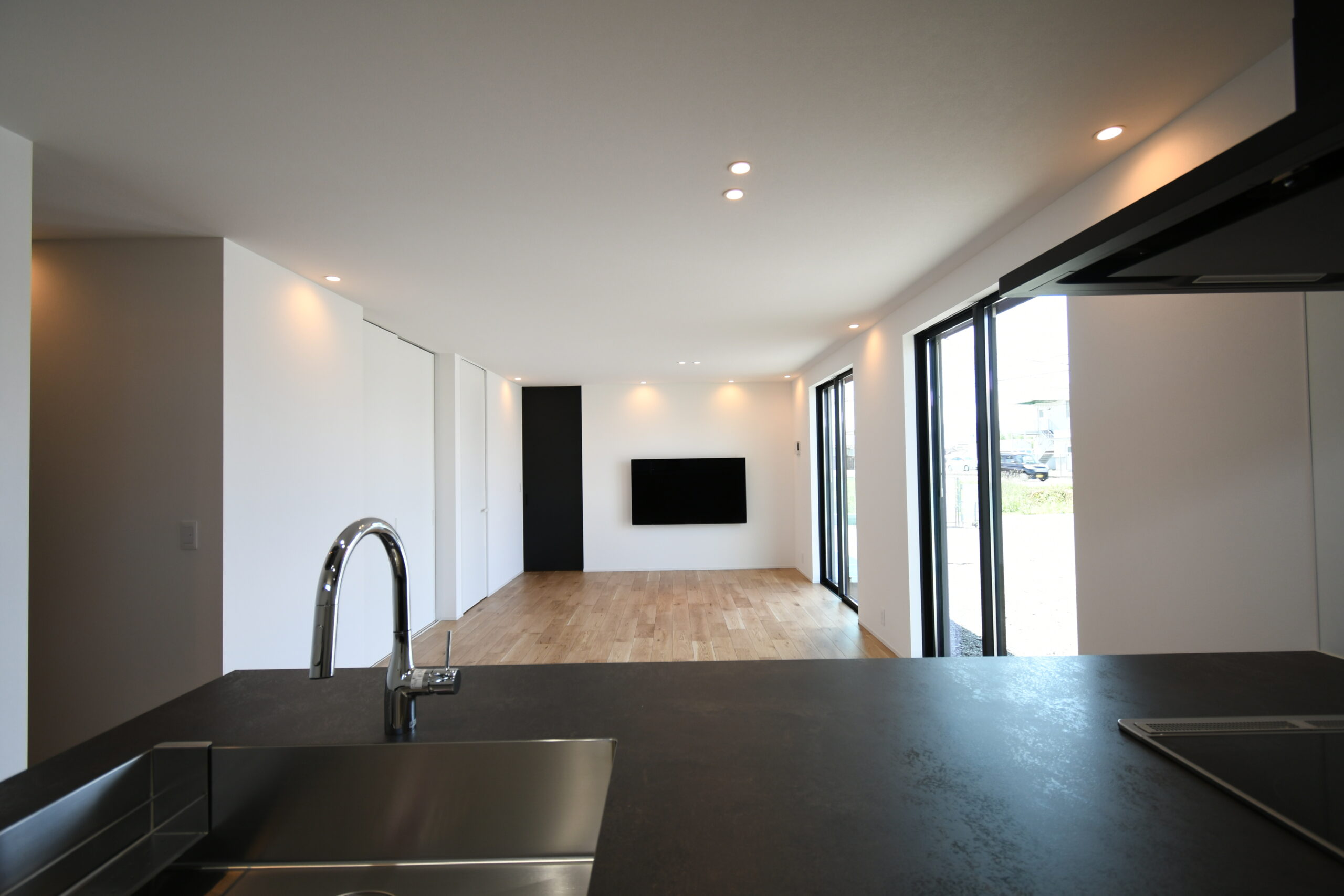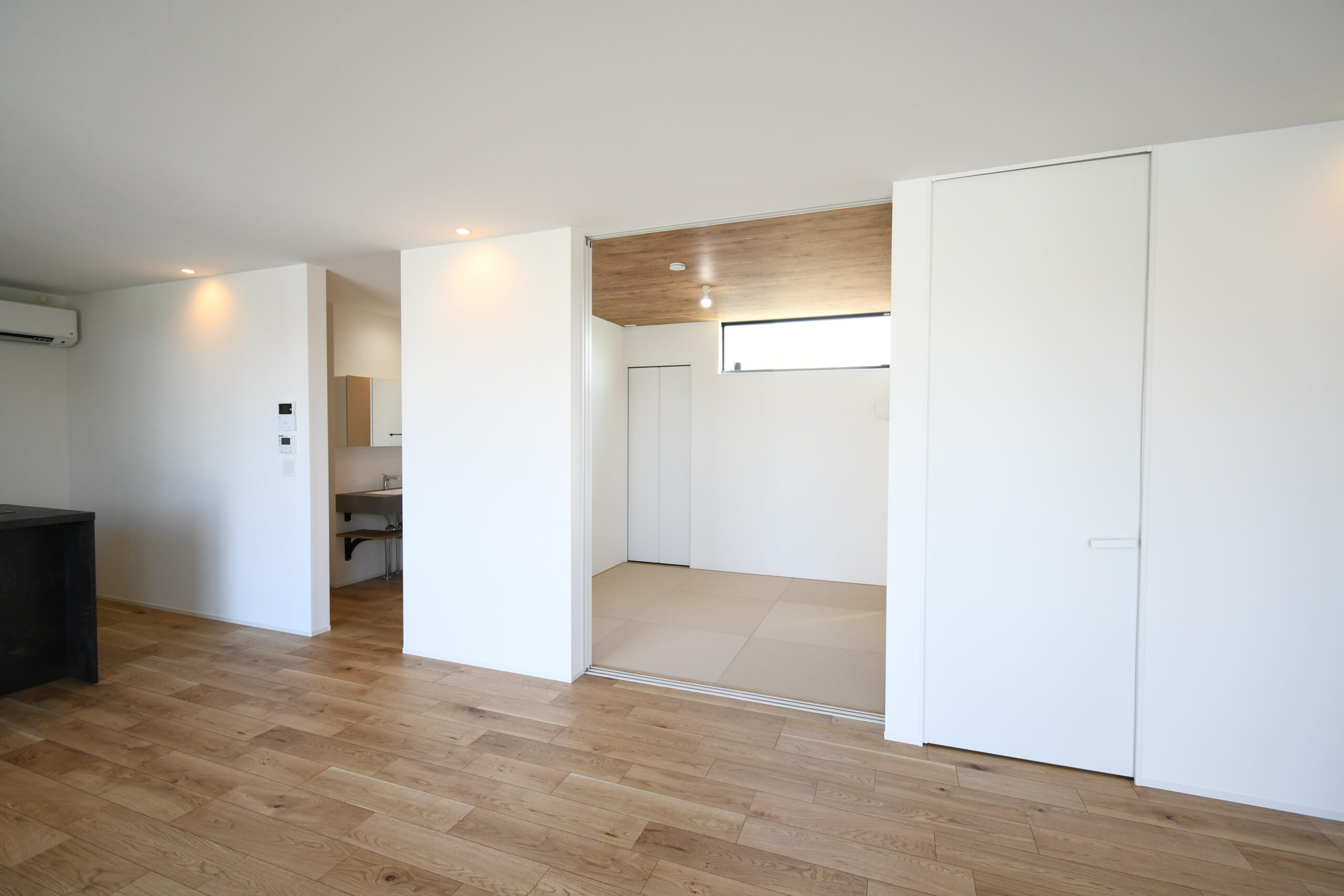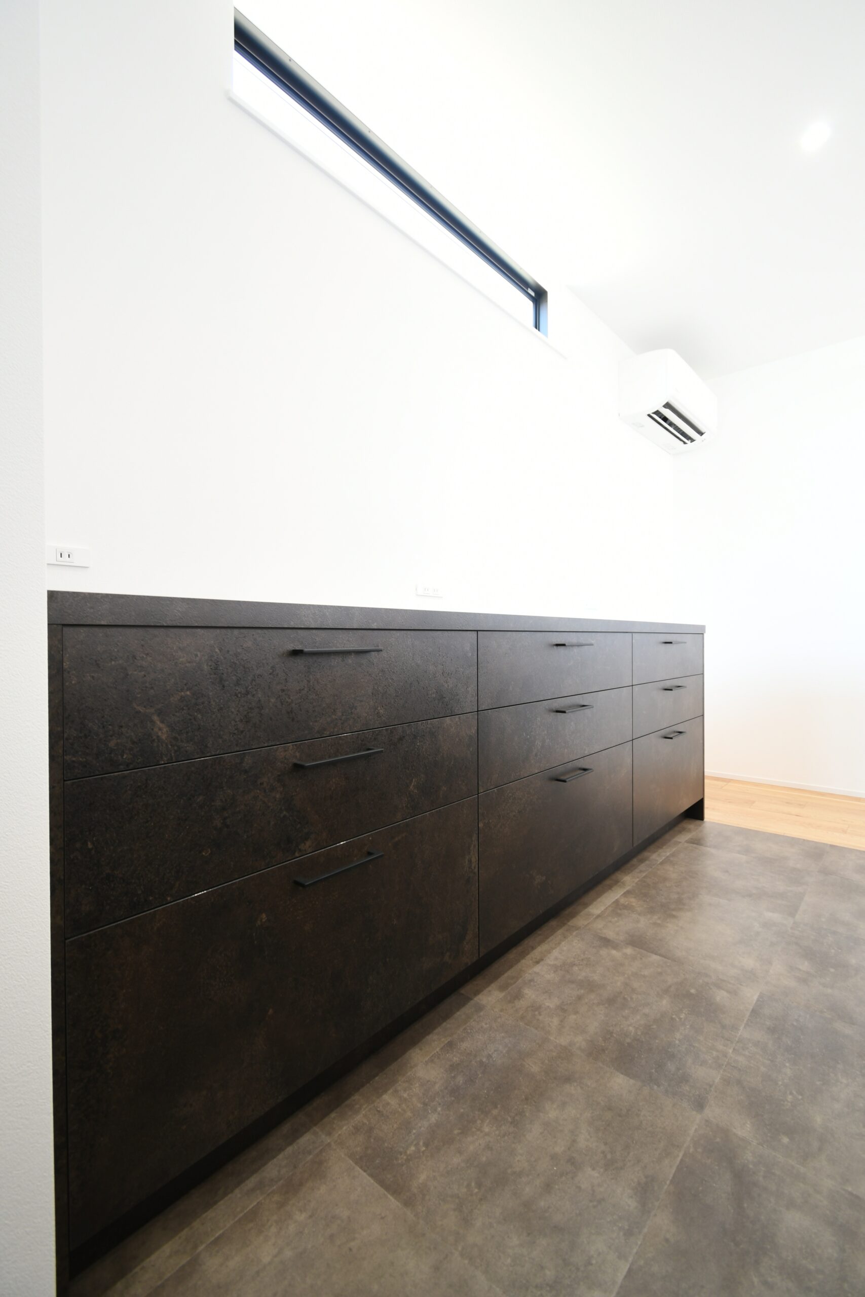LDKを東西横長に配置し、そこから各部屋につながる間取りで廊下を最小限におさめた平屋最強プラン。奥さま憧れのグラフテクトキッチンとAICAの洗面台、ご主人は自慢のアウトドアグッズを贅沢に飾ることができる土間収納を実現するために、緩急をしっかり付けて計画しました。コンパクトな間取りながらも収納は欲しい場所に整っていて、住みやすさもキッチリ確保しています。