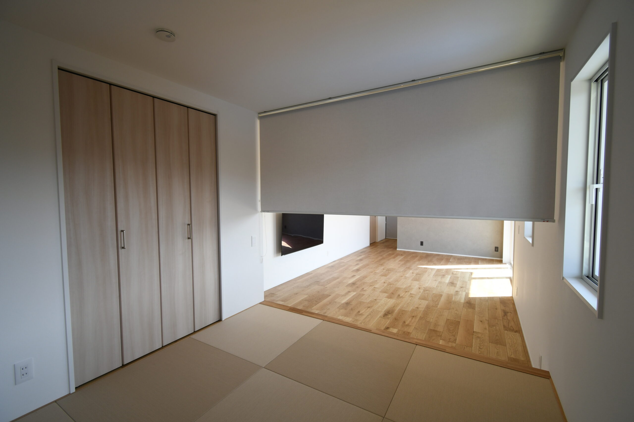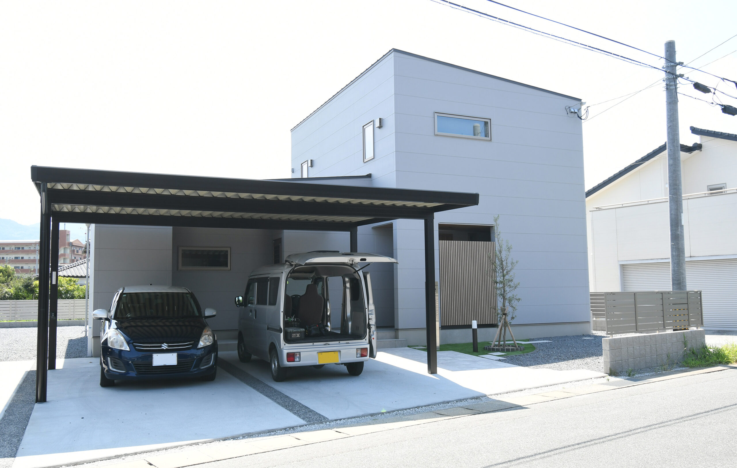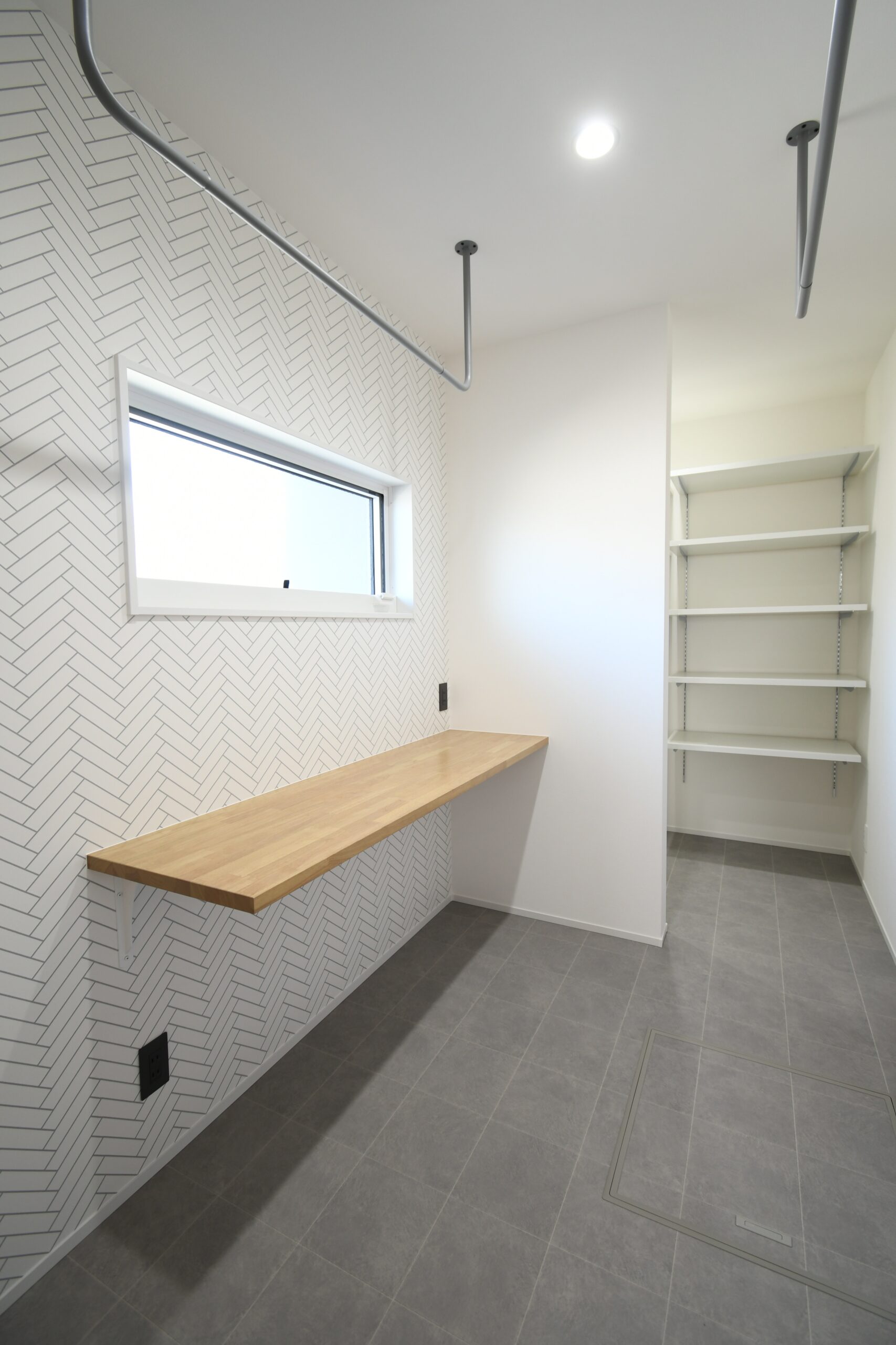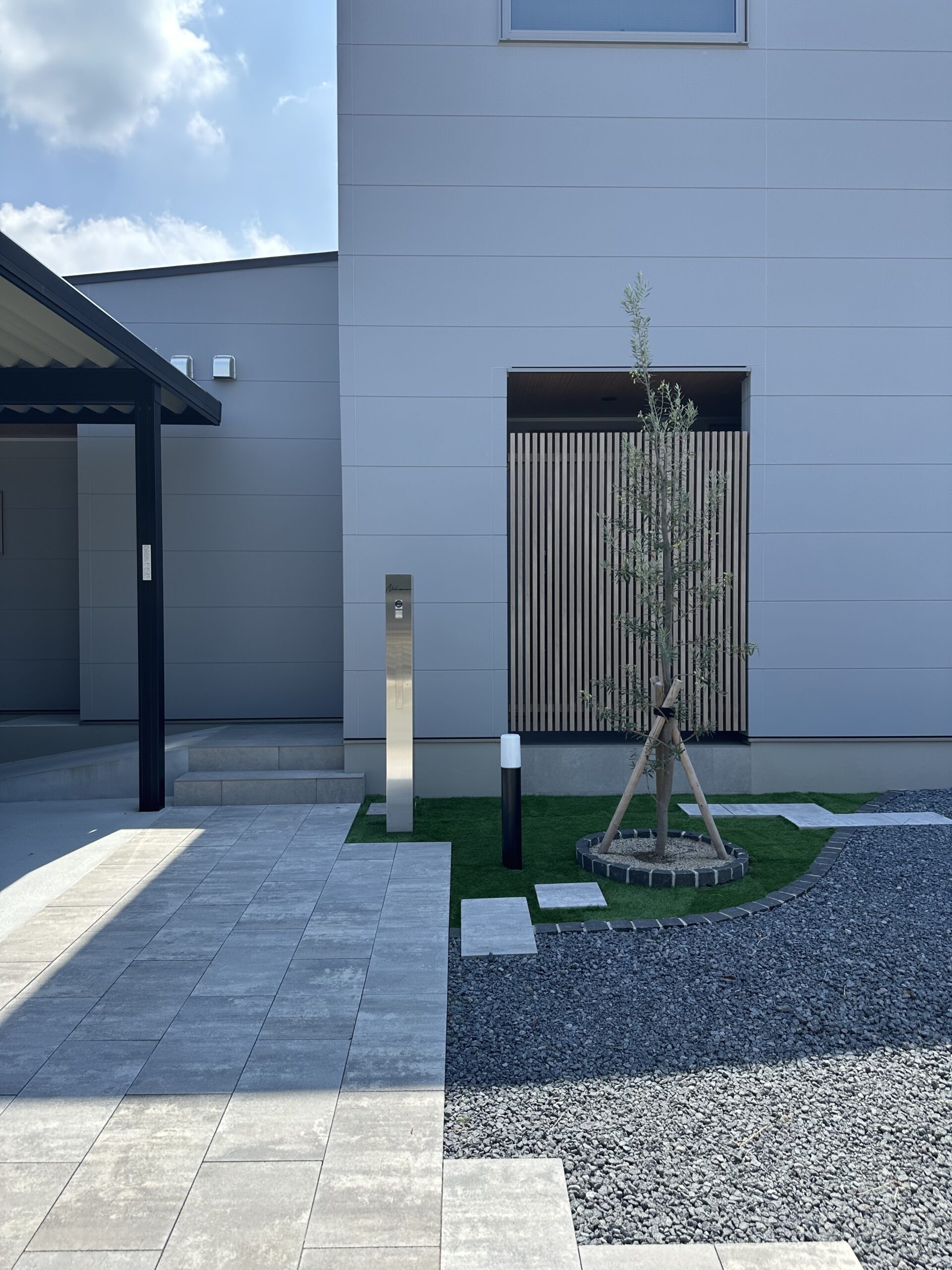 キッチン廻りの回遊動線に、勝手口やあったらいいなのスロップシンクも完備して最強カスタマイズにプランニング。リビング連結の和室は小上がりに、カウンターは掘りごたつ式にと、段差をつけることで圧迫感なく空間を整理しています。玄関ドアが見えないシンプルスタイリッシュな外観は、地形を考慮してお子さんがすぐに飛び出すことのないような安全性とデザイン性を両立。しっかり箱型エントランスで雨の日のお出かけもノーストレスです。