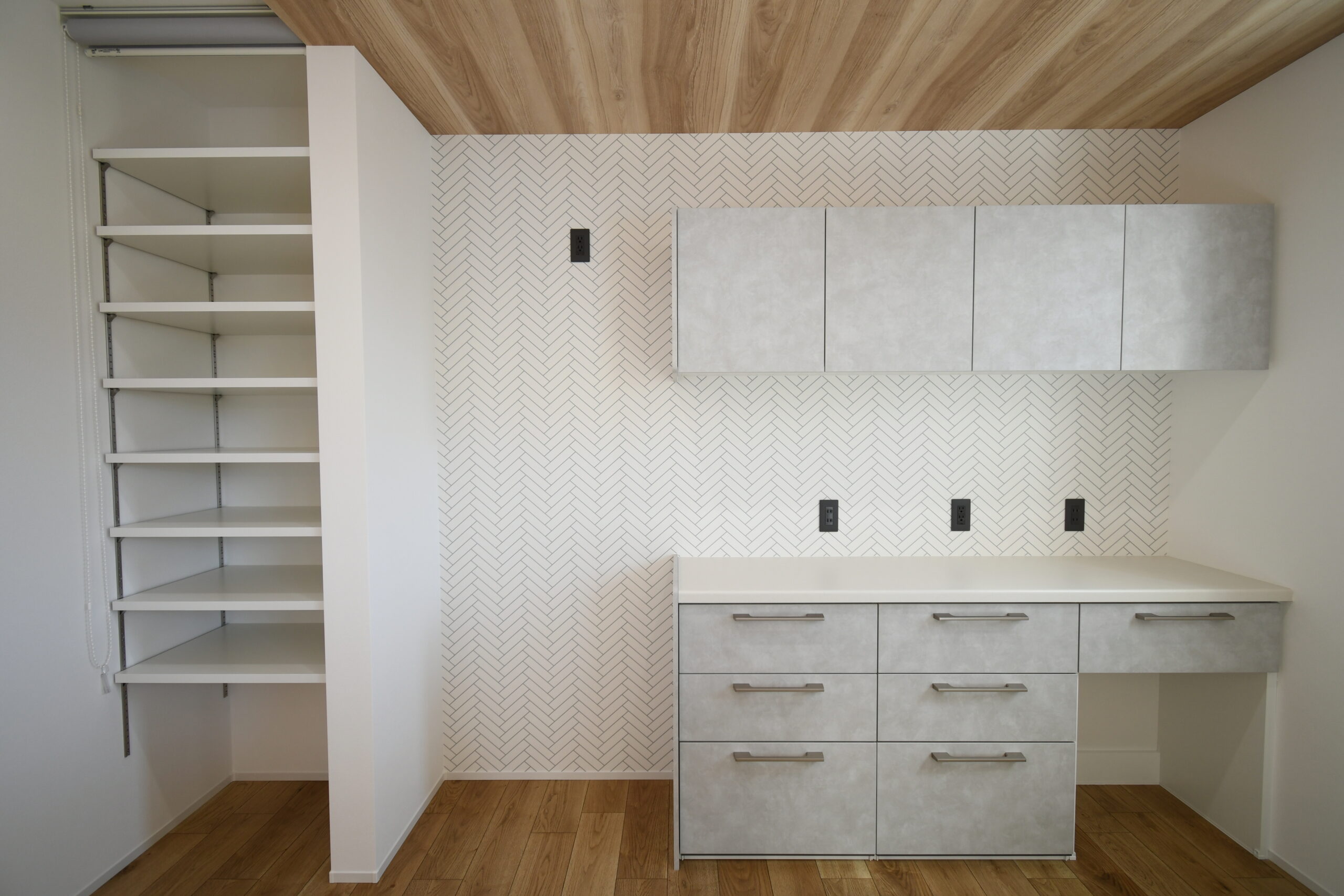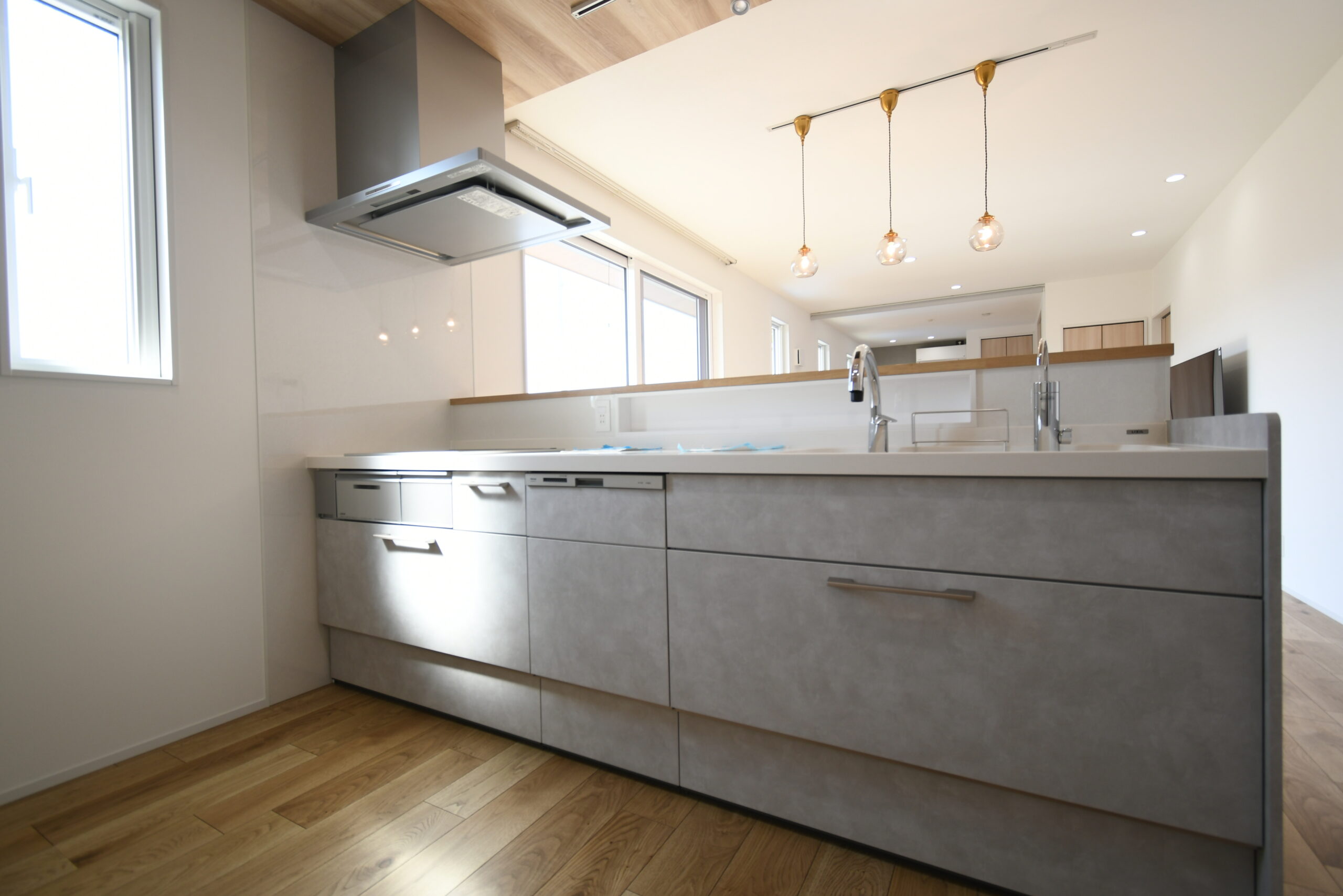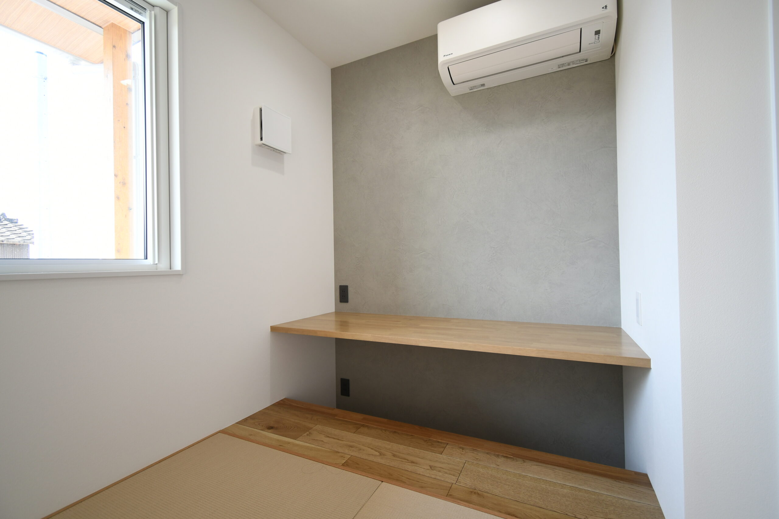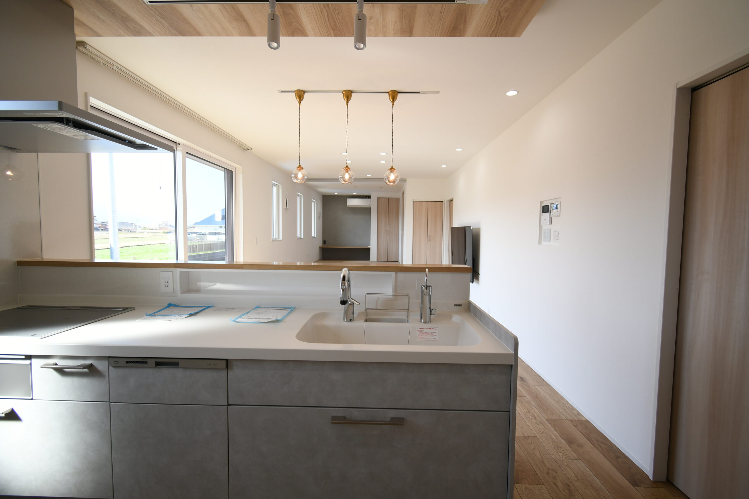 キッチン廻りの回遊動線に、勝手口やあったらいいなのスロップシンクも完備して最強カスタマイズにプランニング。リビング連結の和室は小上がりに、カウンターは掘りごたつ式にと、段差をつけることで圧迫感なく空間を整理しています。玄関ドアが見えないシンプルスタイリッシュな外観は、地形を考慮してお子さんがすぐに飛び出すことのないような安全性とデザイン性を両立。しっかり箱型エントランスで雨の日のお出かけもノーストレスです。