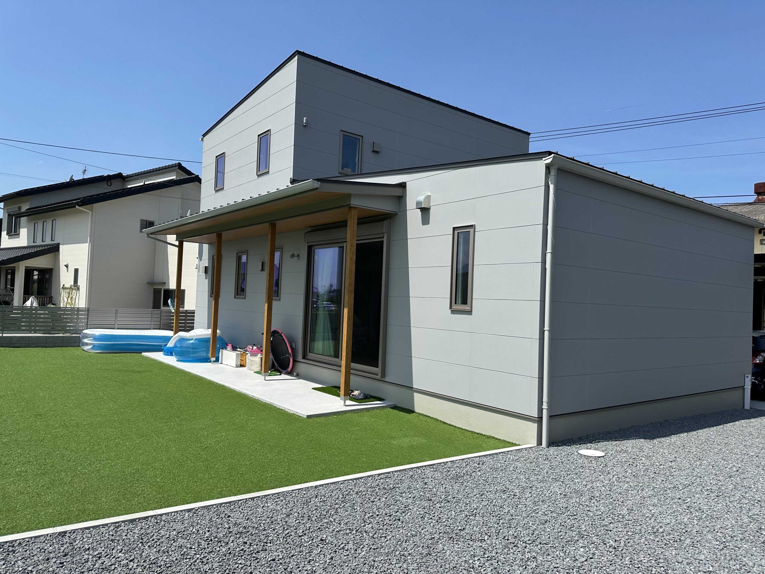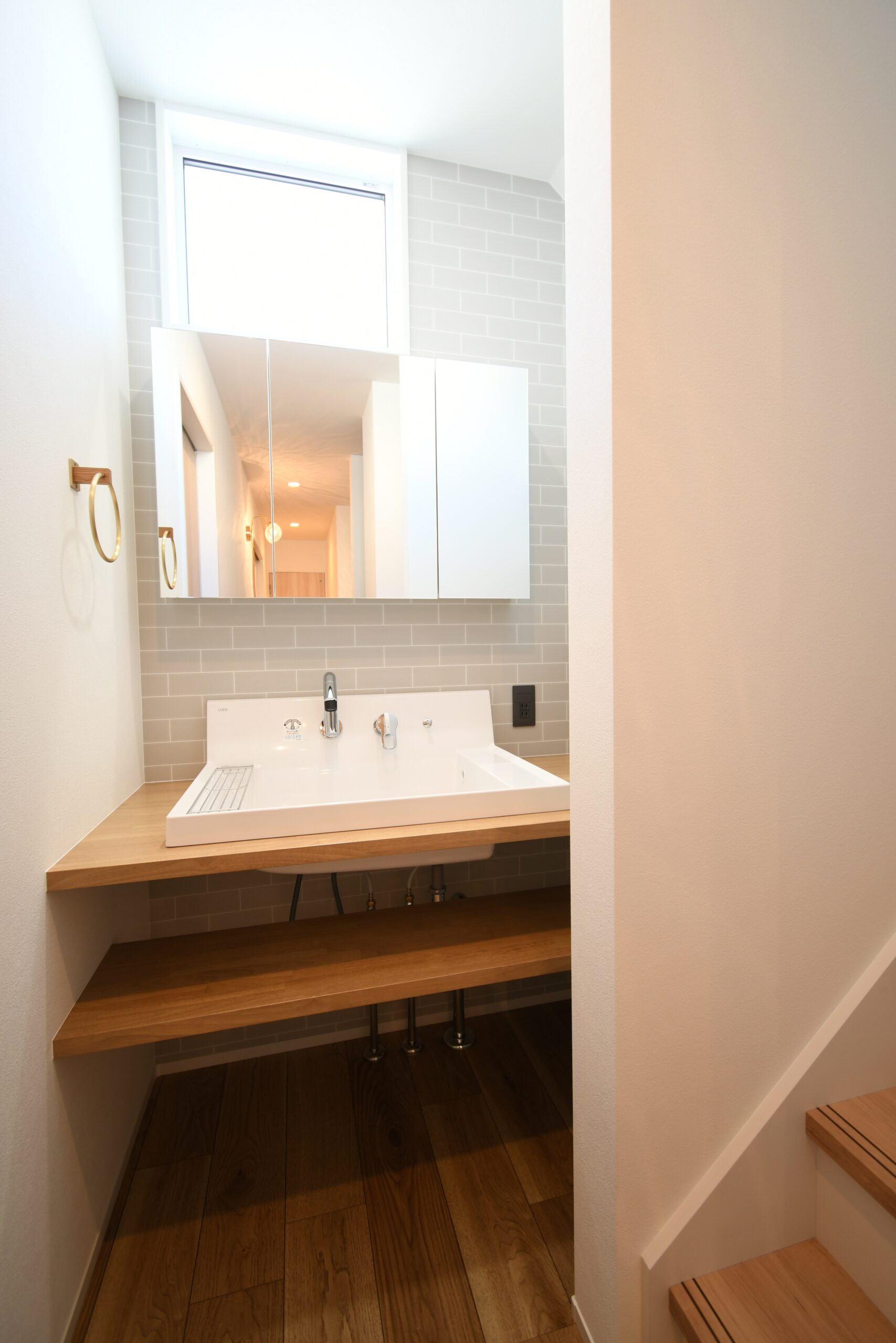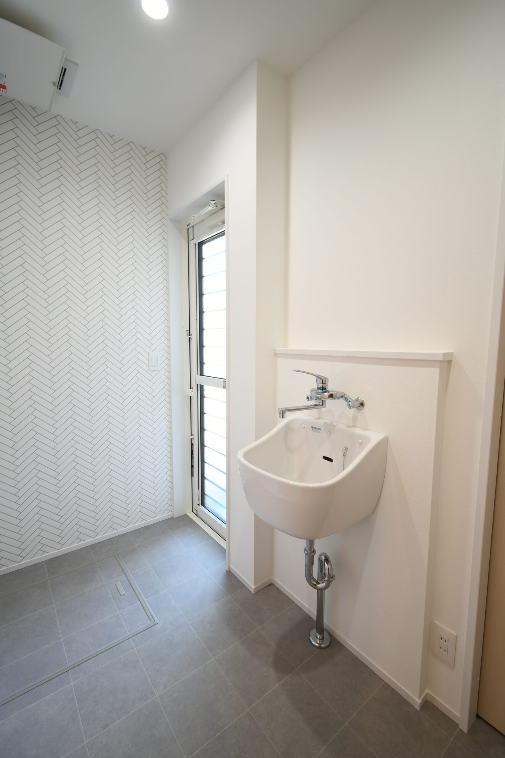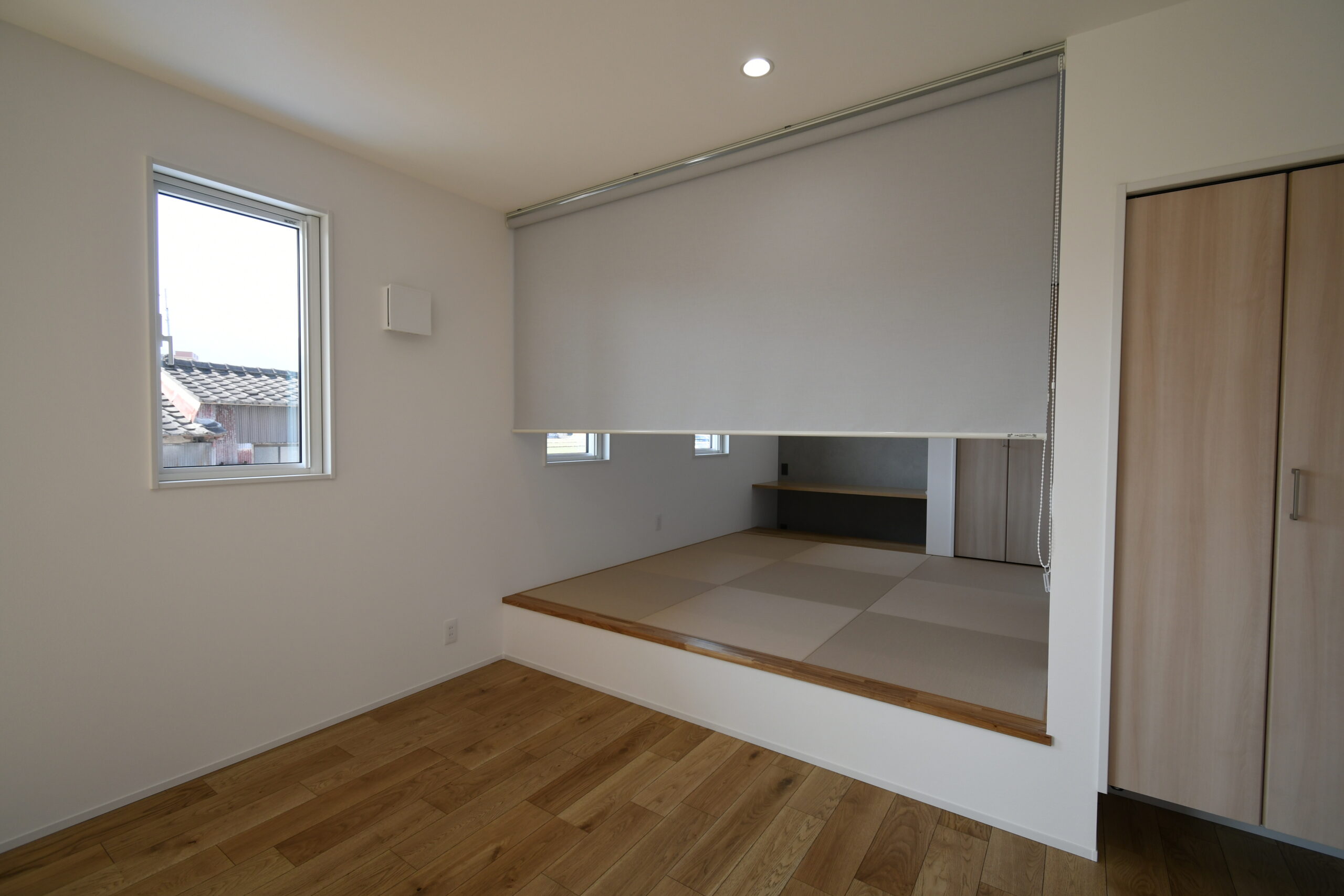 キッチン廻りの回遊動線に、勝手口やあったらいいなのスロップシンクも完備して最強カスタマイズにプランニング。リビング連結の和室は小上がりに、カウンターは掘りごたつ式にと、段差をつけることで圧迫感なく空間を整理しています。玄関ドアが見えないシンプルスタイリッシュな外観は、地形を考慮してお子さんがすぐに飛び出すことのないような安全性とデザイン性を両立。しっかり箱型エントランスで雨の日のお出かけもノーストレスです。