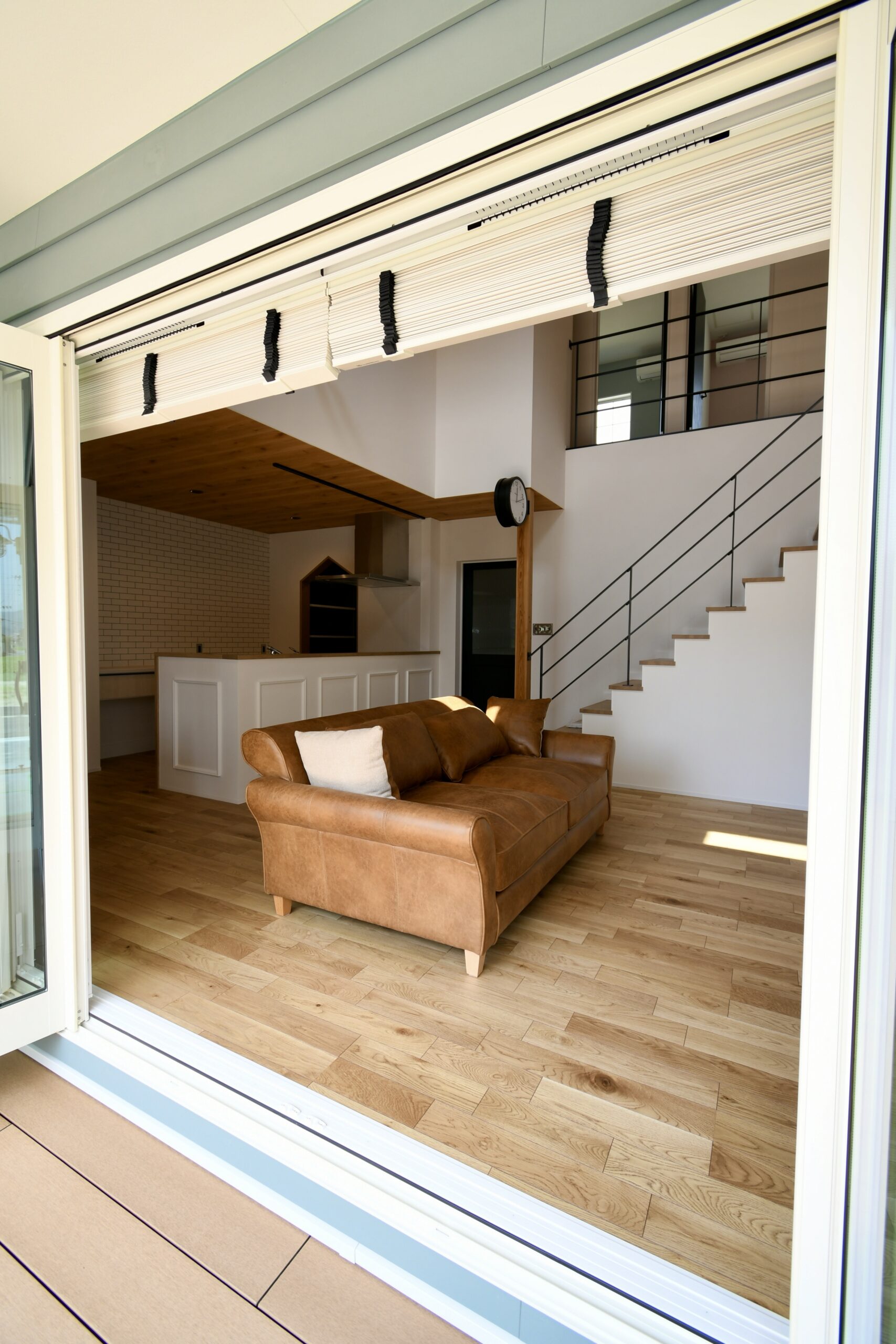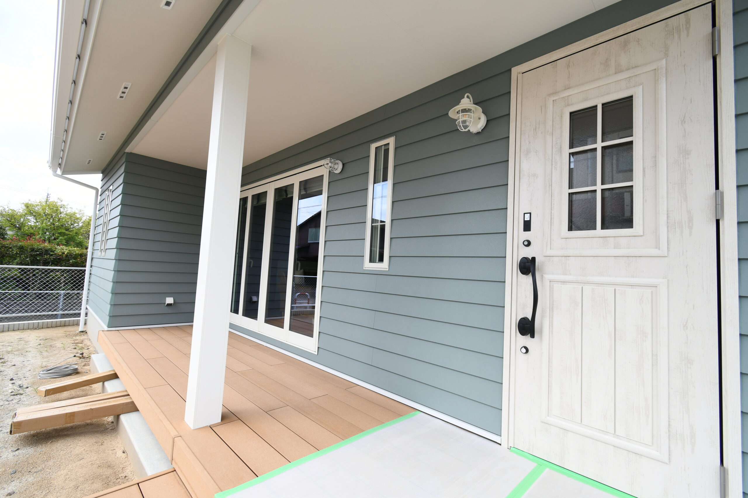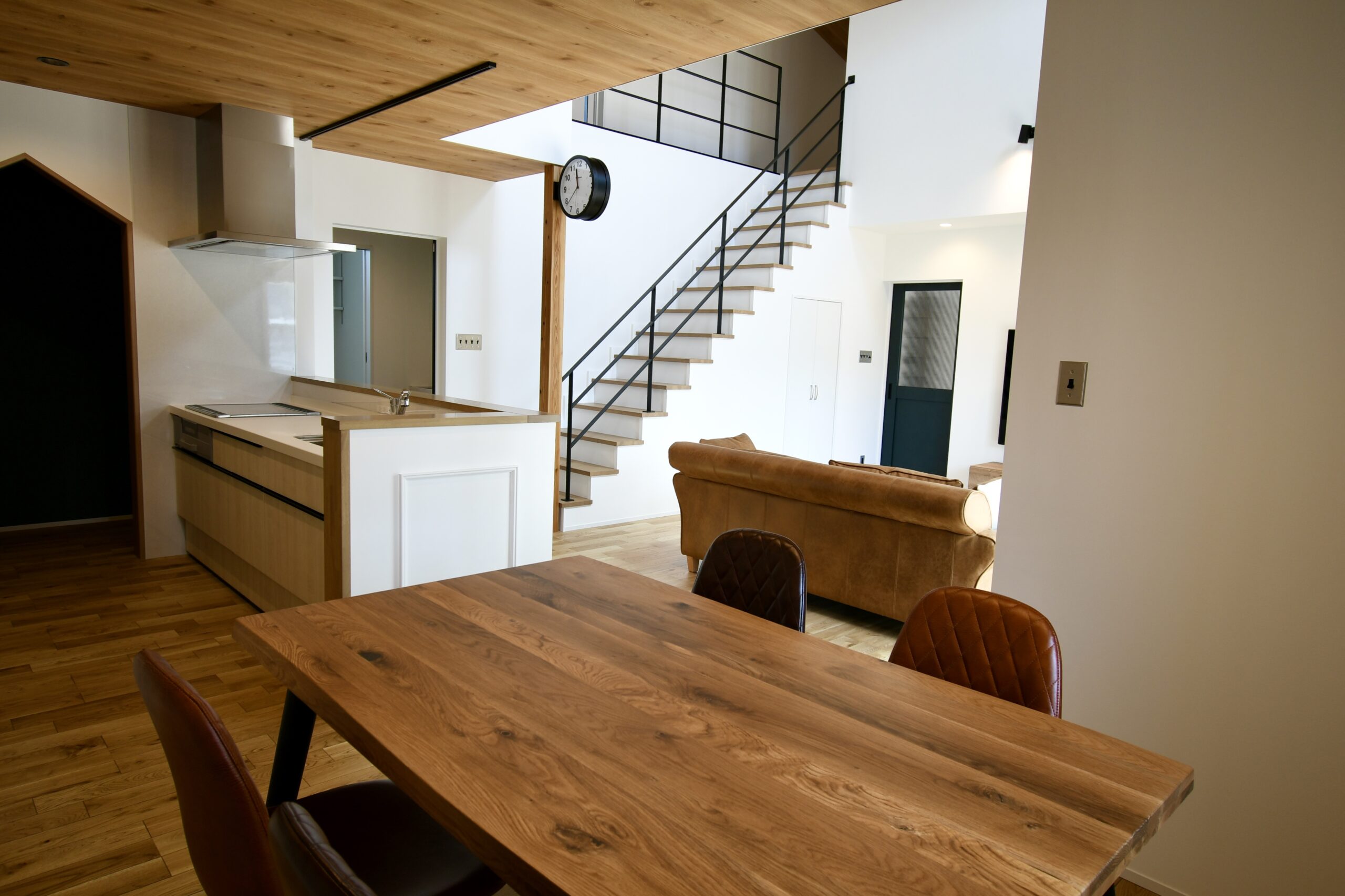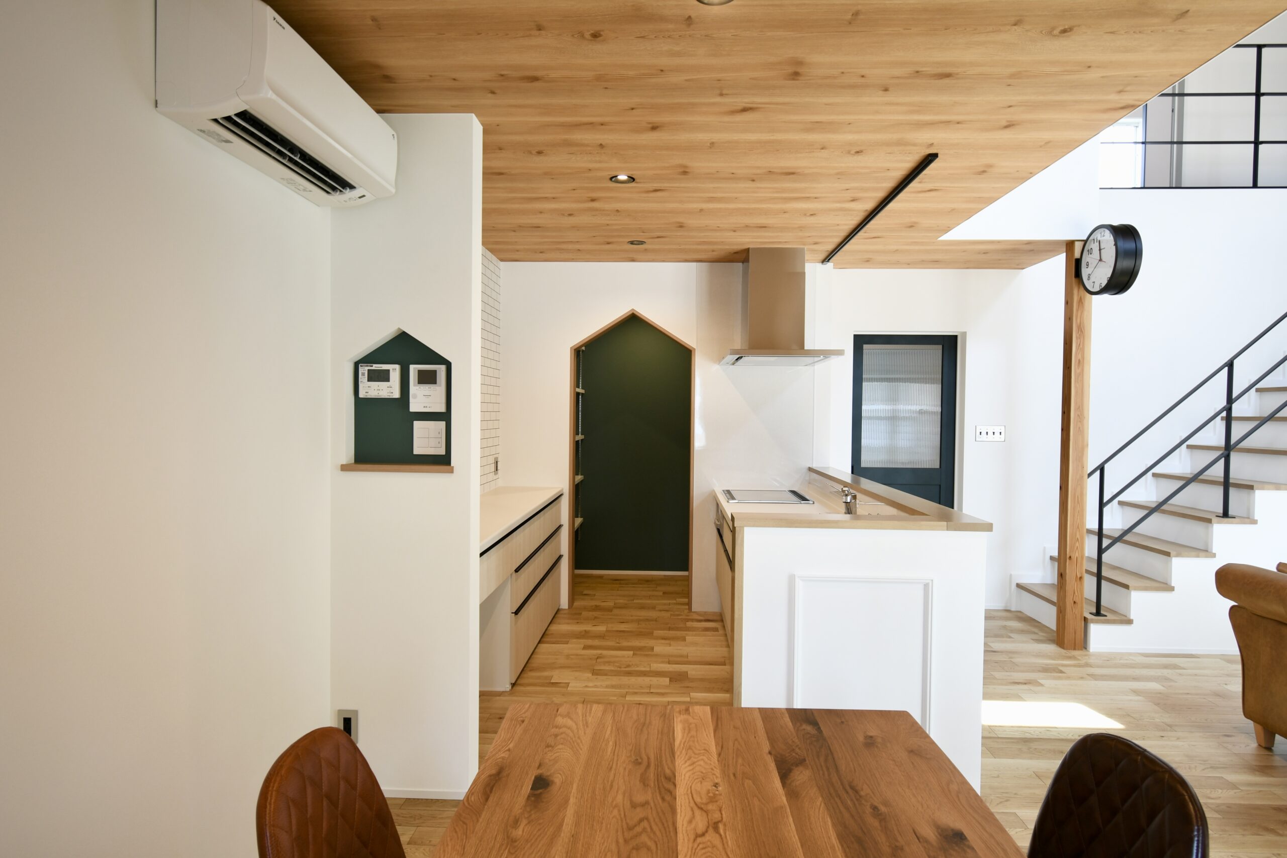 これぞカリフォルニアスタイルな鮮やかグリーンのラップサイディングが印象的なお家です。とってもリラックスなリビングは吹き抜けとオープン階段で『タテ』の抜け感が、ウッドデッキにつながるオープンウィンで屋外と屋内がつながって『ヨコ』の抜け感が〇な空間です。キッチンはリビング側から見えないパントリーや横並びダイニングで家事動線をすっきりスムーズに。ほしい場所にしっかりボリュームの収納スペースがあるので、お家の中もしっかりと片付きます。ネイビーの室内ドアや照明スイッチ、キッチンのモール壁造作など、ご家族のお気に入りをギュッと詰め込んで、毎日がわくわくと楽しい♪そんなお家です。
