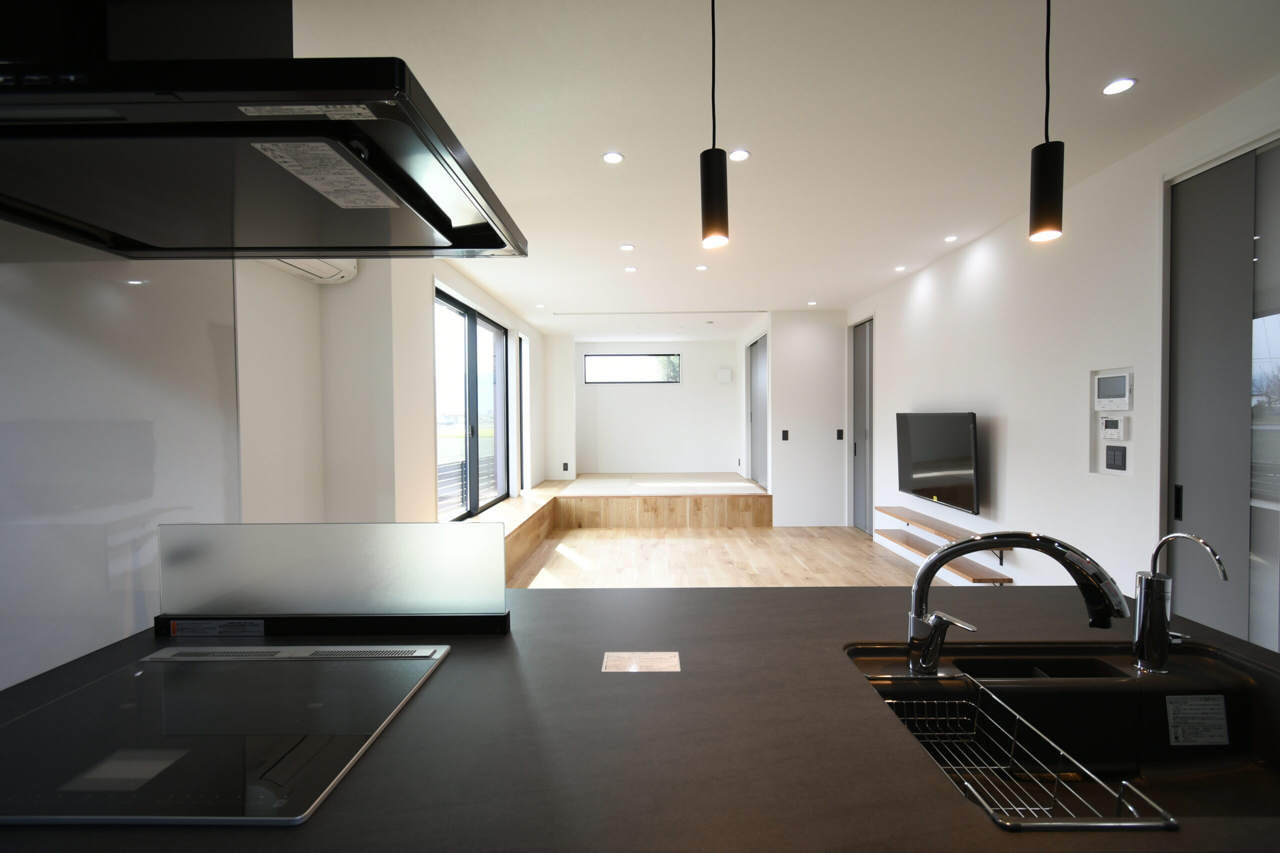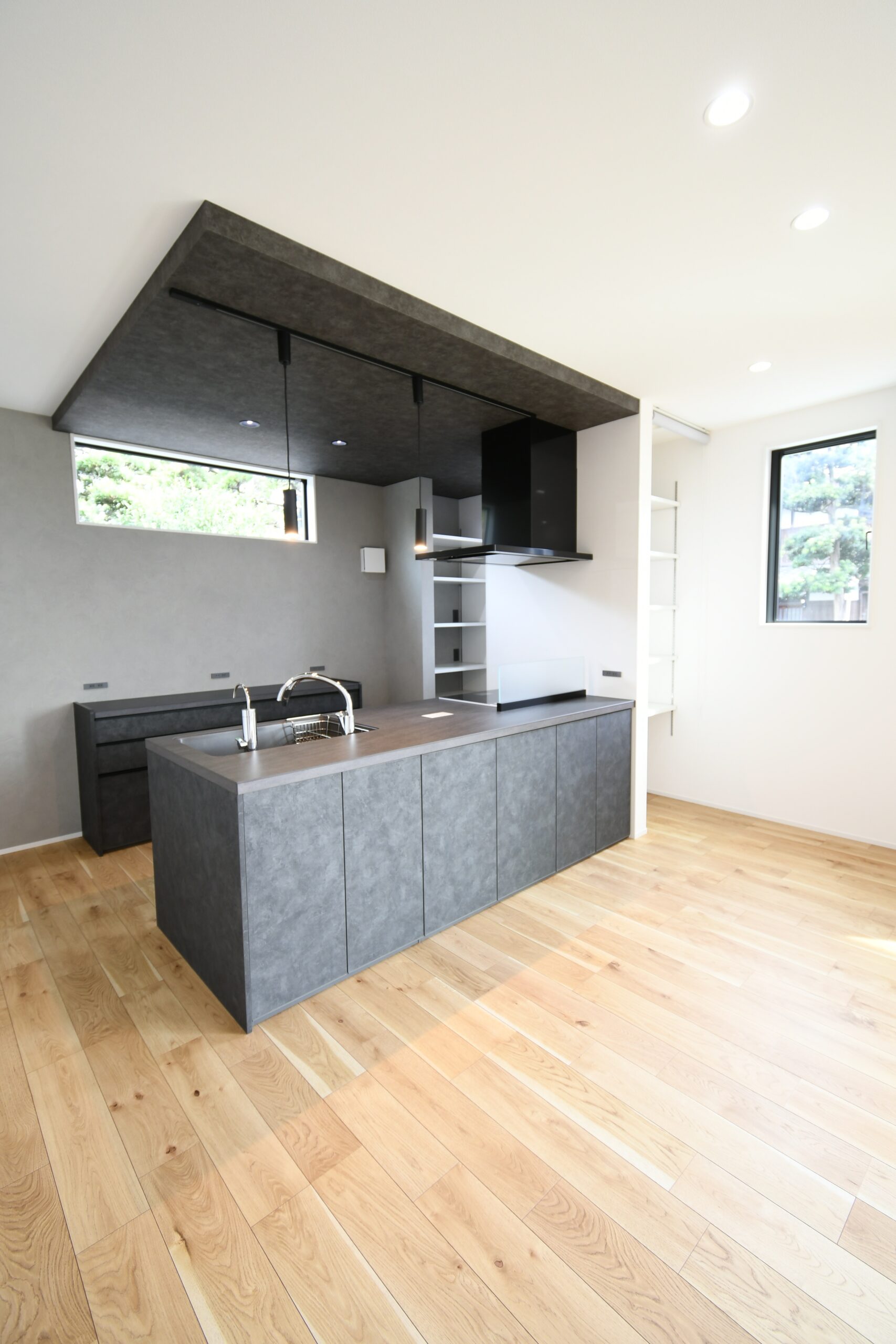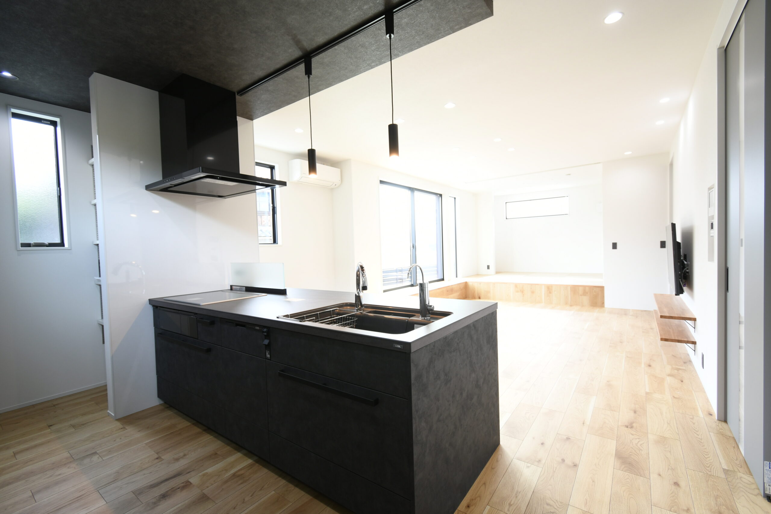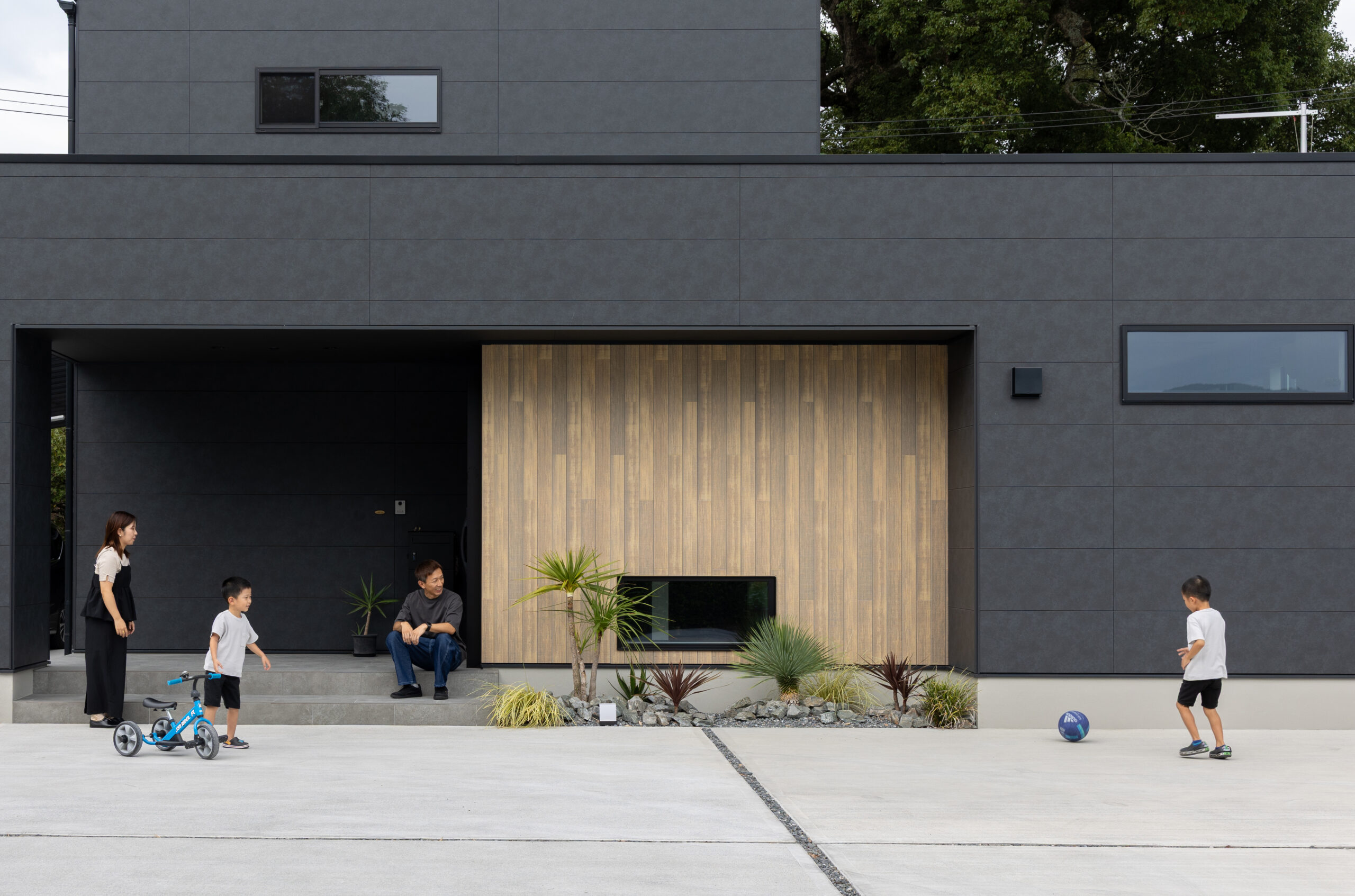 吹抜けの玄関ホールを通ってリビングに入ってすぐに目を引く、掃出し窓に面した横長ベンチと、それにつながる小上がり和室の一体は迫力の大解放空間。お友達の多いご夫婦がたくさんご招待しても全員がくつろげるほどの広がりが感じられます。ハイグレードなペニンシュラキッチンからサクッと移動できる水廻り回遊動線は、家族みんなのプライバシーと使いやすさを追求。軒が深く、正面から見えない配置の玄関引き戸や造作階段にもこだわりがぎゅっと詰まっています。