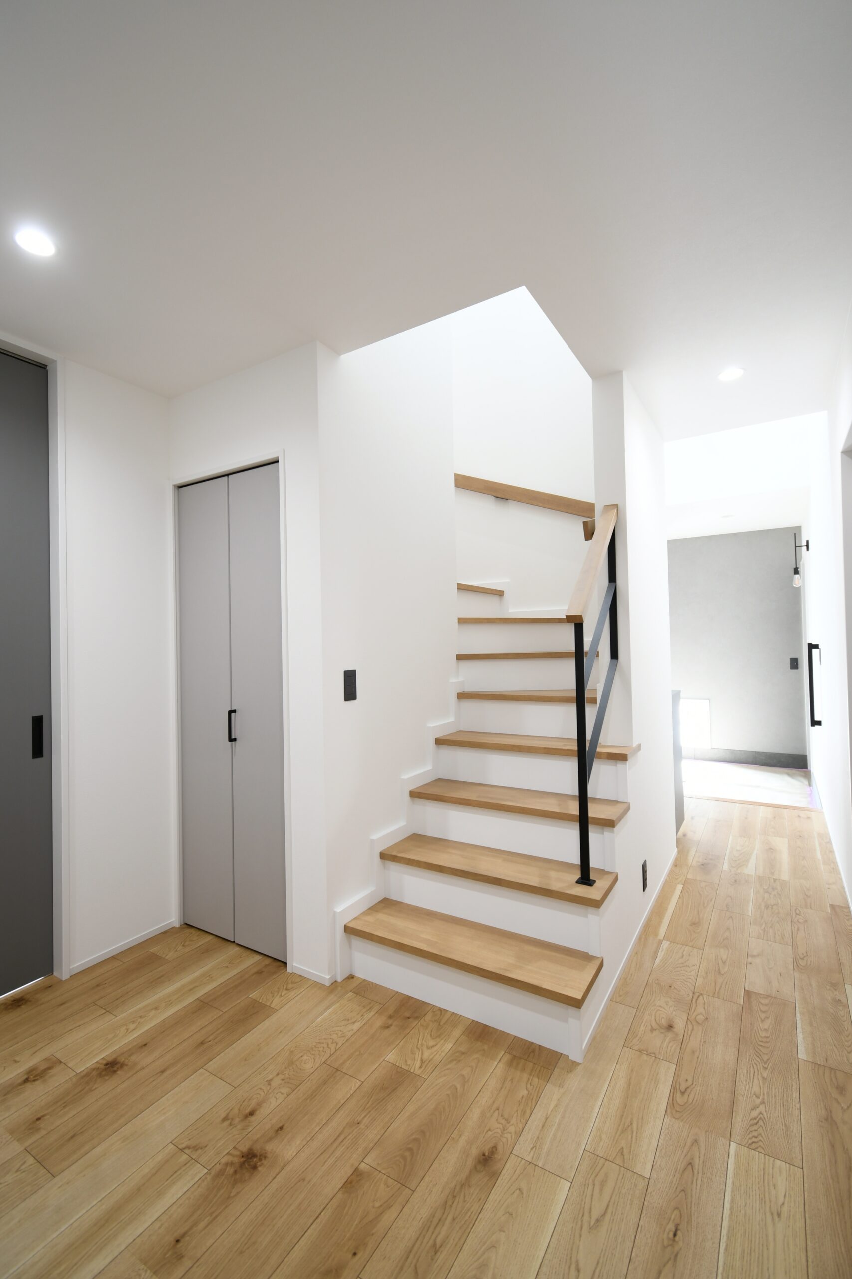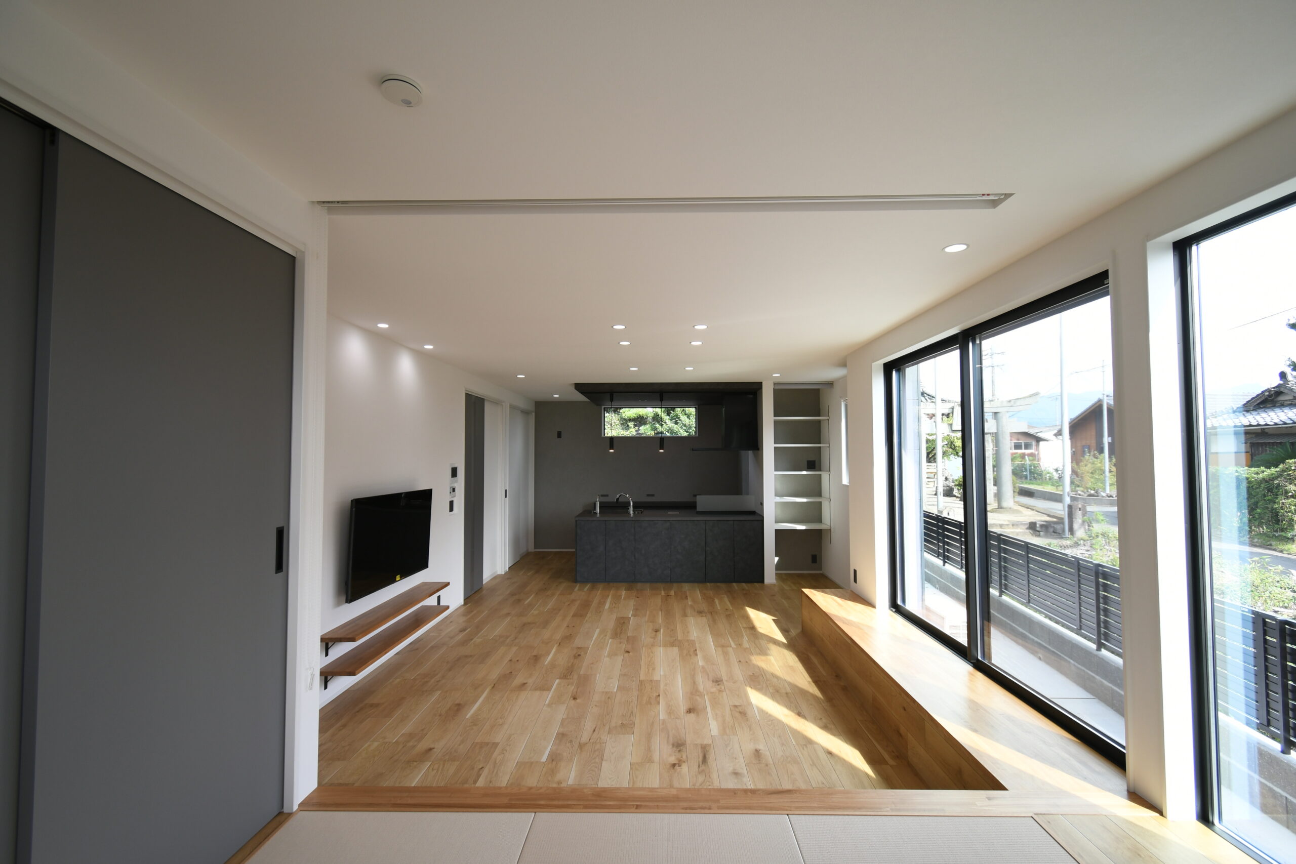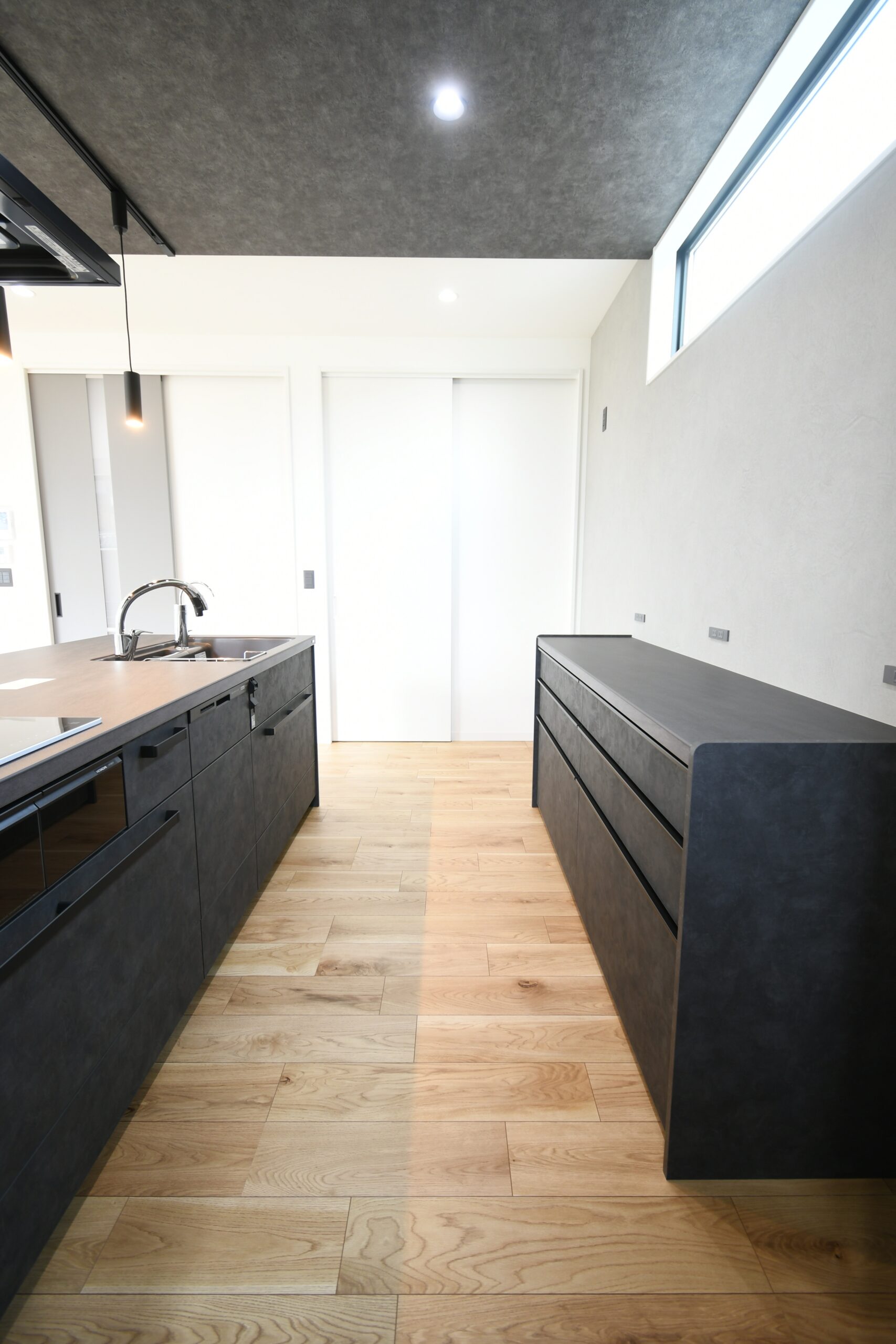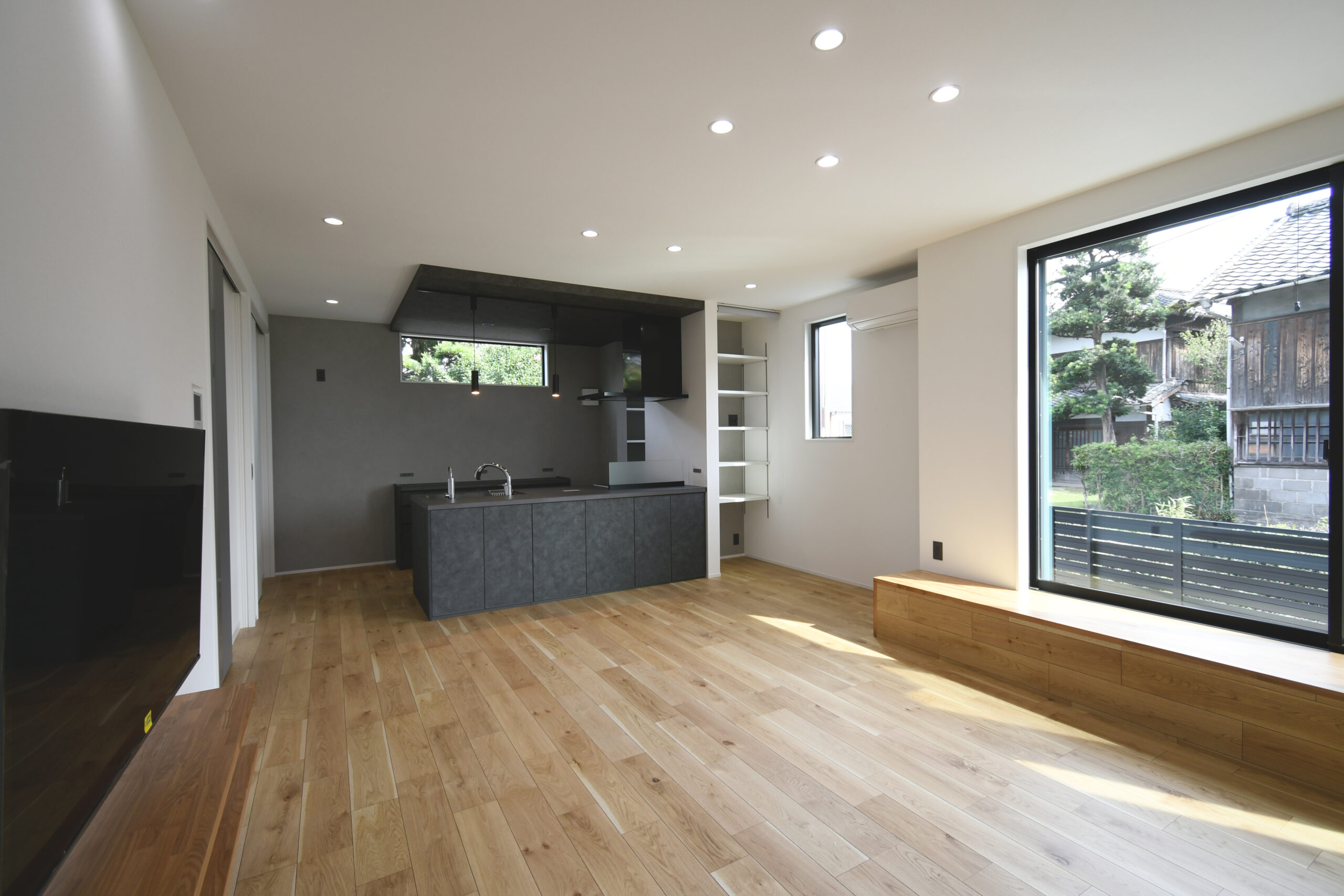 吹抜けの玄関ホールを通ってリビングに入ってすぐに目を引く、掃出し窓に面した横長ベンチと、それにつながる小上がり和室の一体は迫力の大解放空間。お友達の多いご夫婦がたくさんご招待しても全員がくつろげるほどの広がりが感じられます。ハイグレードなペニンシュラキッチンからサクッと移動できる水廻り回遊動線は、家族みんなのプライバシーと使いやすさを追求。軒が深く、正面から見えない配置の玄関引き戸や造作階段にもこだわりがぎゅっと詰まっています。